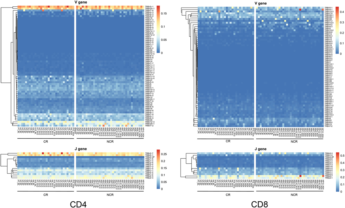 Figure 1. Heatmap of Vβ and Jβ gene segments usage in CD4 and CD8 T cells in the complete response (CR) and non-complete response (NCR) patient groups. The heatmap bar indicates the usage frequency of the Vβ or Jβ gene segments in each sample. The sample numbers of the CR and NCR groups are indicated on the x-axis.
