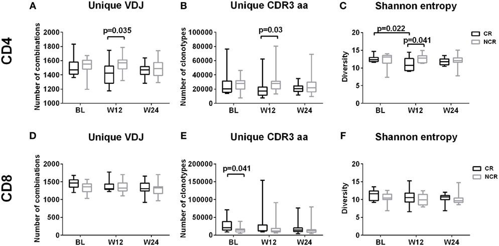 Figure 2. Diversity of CD4 and CD8 T cell repertoires during early nucleos(t)ide analog treatment. Longitudinal analysis of the number of unique VDJ combinations (A,D), complementarity-determining region 3 (CDR3) aa clonotypes (B,E), and Shannon entropy values (C,F) in CD4 and CD8 T cells in the complete response (CR) and non-complete response (NCR) groups, respectively; P-values less than 0.05 are shown. The x-axis represents treatment timepoints. BL, baseline; W12, week 12; W24, week 24.