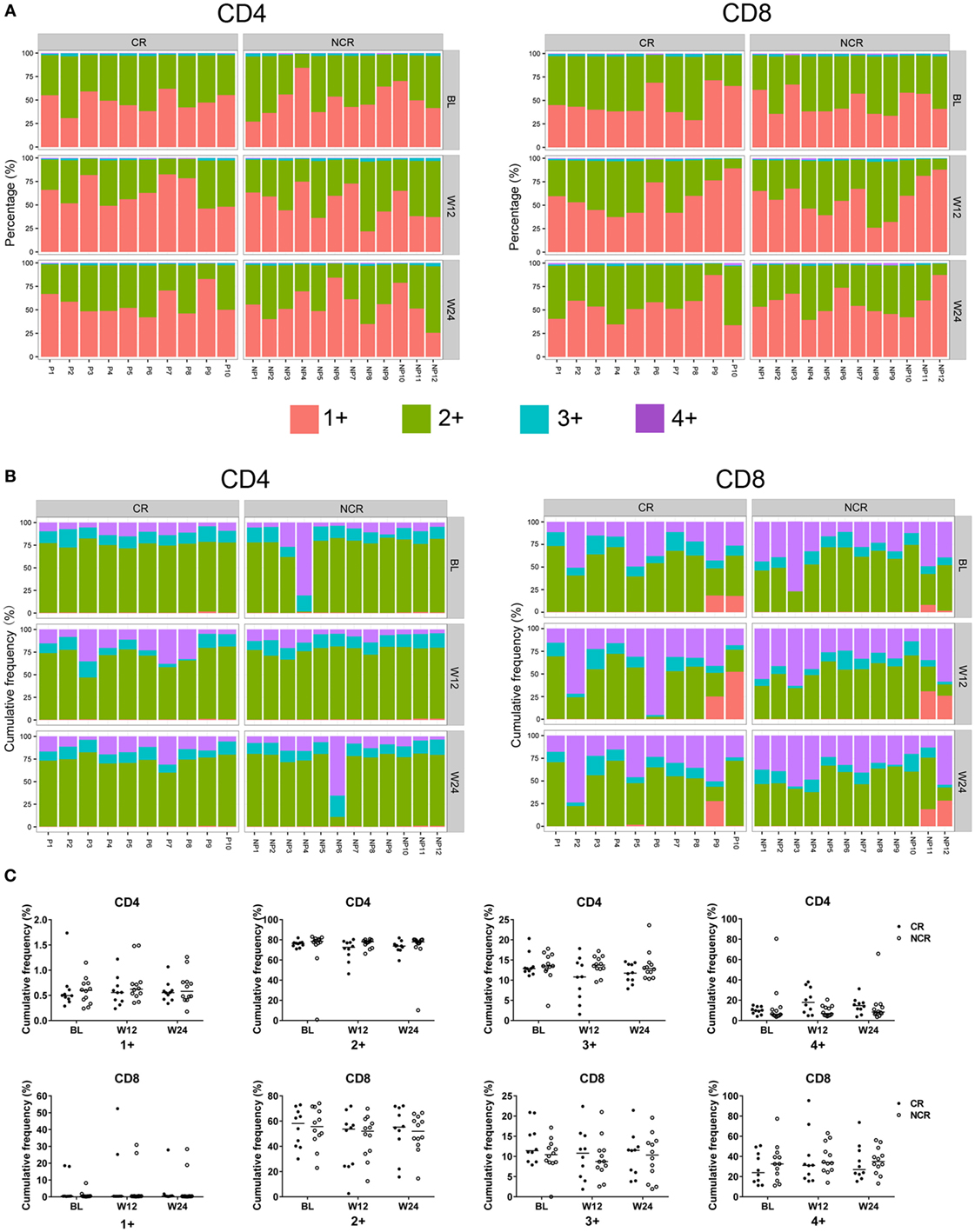Figure 3. Clone distribution of CD4 and CD8 T cells in the chronic hepatitis B patients at baseline, week 12, and week 24 of treatment. Each CD4 and CD8 clonotype was assigned to one of four classes at each time point based on the frequency of the clonotype, and the percentage of unique clonotypes (A) and the cumulative frequency of clonotypes (B) within identical classes are shown. (C) Comparisons of the cumulative frequency of CD4 and CD8 clonotypes in the four classes at each time point. No significant differences were observed. The patient numbers are indicated on the x-axis. P, patients in complete response (CR) group; NP, patients in non-complete response (NCR) group.