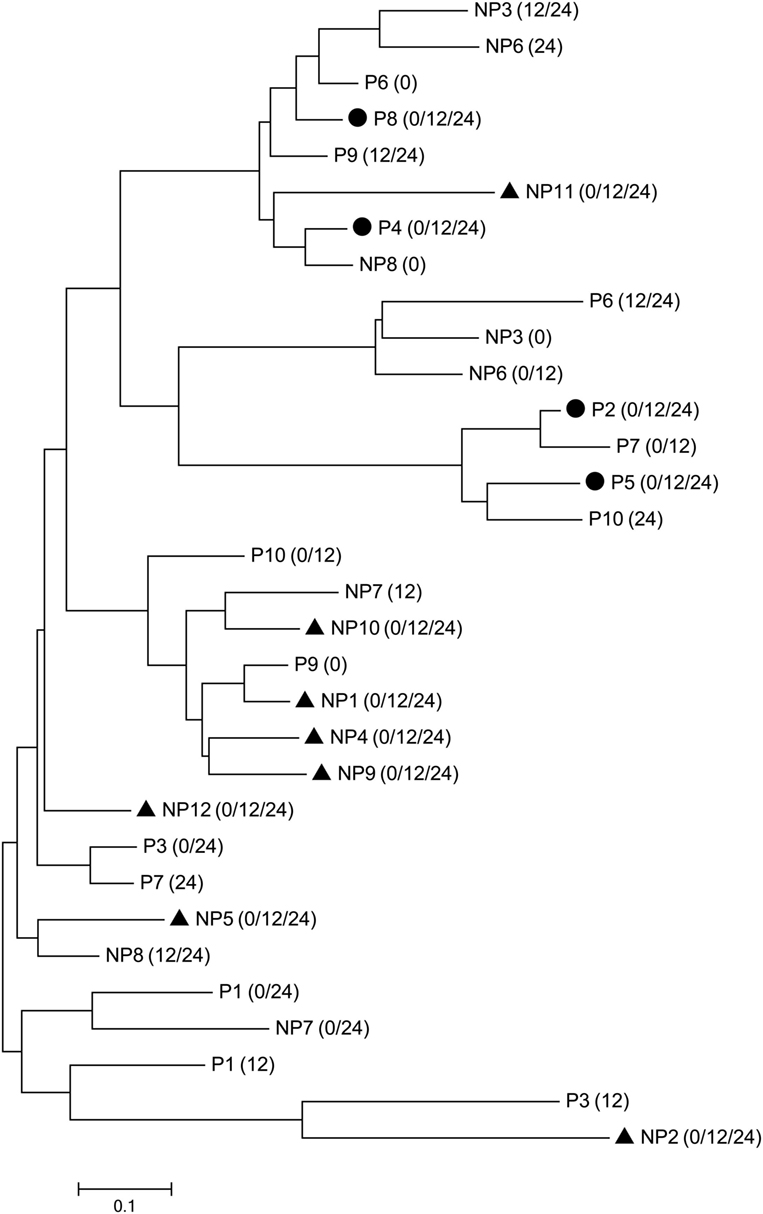 Figure 5. Clustering of the top 1 CD8 clonotypes at each time point. The top 1 complementarity-determining region 3 (CDR3) sequences of the complete response (CR) and non-complete response (NCR) groups are denoted by P (CR group) or NP (NCR group) + patient ID, respectively. The time point of the CDR3 sequence is indicated in parentheses. The circle (●) and triangle (▲) represent identical CDR3 sequences at baseline, week 12, and week 24 within individual patients from the CR and NCR groups, respectively.