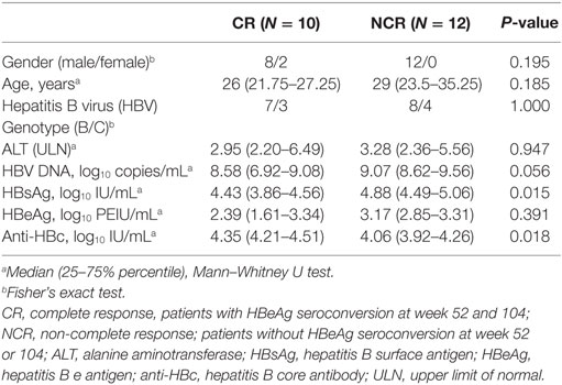 A total of 22 HBeAg-positive CHB patients were enrolled from Nanfang Hospital (Guangzhou, China). All the patients participated in a prospective clinical trial of telbivudine-based therapy (38, 39). The inclusion criteria were as follows: hepatitis B surface antigen (HBsAg)-positive status for at least 6 months; HBeAg-positive and anti-HBe-negative; HBV DNA >5 log10 copies/mL; alanine aminotransferase (ALT) ≥2 and <10× the upper normal limit; and without any antiviral treatment within 6 or 12 months. The exclusion criteria have been described elsewhere (38). The 22 patients were subdivided into complete response (CR, n = 10) and non-complete response (NCR, n = 12) groups based on HBeAg status and HBV DNA level at weeks 52 and 104 of treatment. Patients in the CR group achieved HBeAg seroconversion and had a level of serum HBV DNA of <300 copies/mL at week 52, which was sustained at week 104, while patients in the NCR group maintained HBeAg positivity and an HBV DNA level >300 copies/mL at weeks 52 and 104. All the patients achieved normal ALT levels at weeks 52 and 104. The baseline characteristics of the patients are provided in Table 1. This study was conducted according to the Declaration of Helsinki and was approved by the Ethics Committee of Nanfang Hospital. Written informed consent was obtained from all the patients.