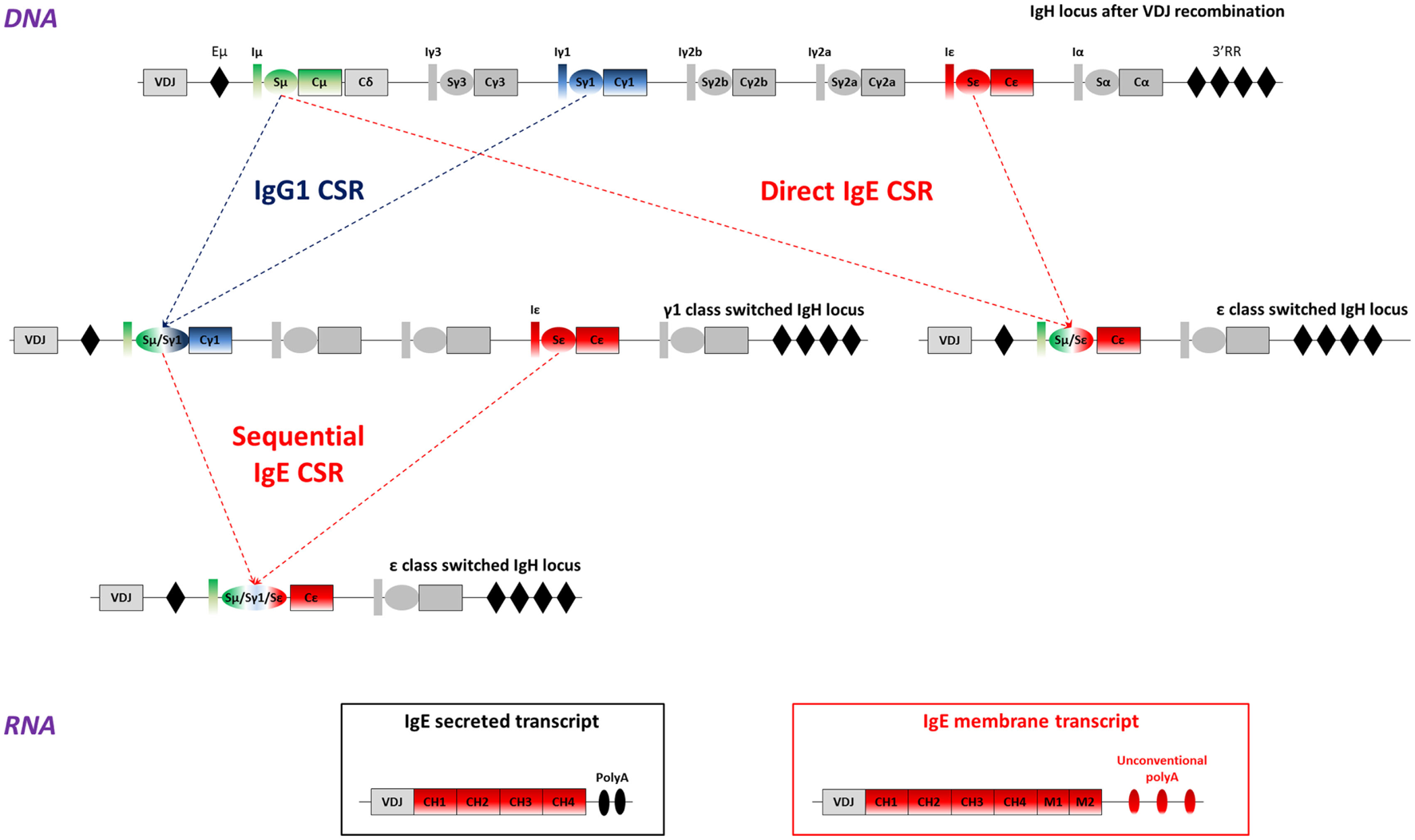 IgE class switch recombination, secreted, and membrane IgE (mIgE) transcripts. Top: mouse WT IgH locus is represented after VDJ recombination (not to scale). The recombined VDJ gene and constant (C) genes are represented as outlined boxes. I exons (I) and switch (S) regions preceding each constant gene (excepted Cδ) are represented as boxes and ovals, respectively. Black diamonds portray important regulatory elements: the intronic enhancer μ (Eμ), and the super-enhancer 3′ regulatory region (3′RR). Upper-middle: after B-cell activation, activation-induced deaminase (AID) is expressed and exerts its mutagenic activity on the VDJ gene, allowing production of antibodies with increased affinity for the Ag. AID is also targeted to S regions to initiate DNA double strand breaks, thereby inducing class switch recombination (CSR) between two S regions, here Sμ and Sγ1, or Sμ and Sε. This process allows the production of high-affinity IgG1 antibodies, or low-affinity IgE. Lower-middle: cells can undergo more rounds of cell cycle or re-express AID after re-exposure to antigen and undergo a sequential CSR event, from γ1 to ε here, to produce high-affinity IgE antibodies. Bottom: IgE class-switched cells produce two main transcripts: mIgE transcripts including the four constant exons (CH1 to CH4), the two membrane (M1 and M2) anchor domains and unconventional polyadenylation (polyA) signals and/or secreted IgE transcripts, containing the constant genes and two conventional polyA signals. Alternate IgE transcripts have been described and could contribute to IgE response regulation.