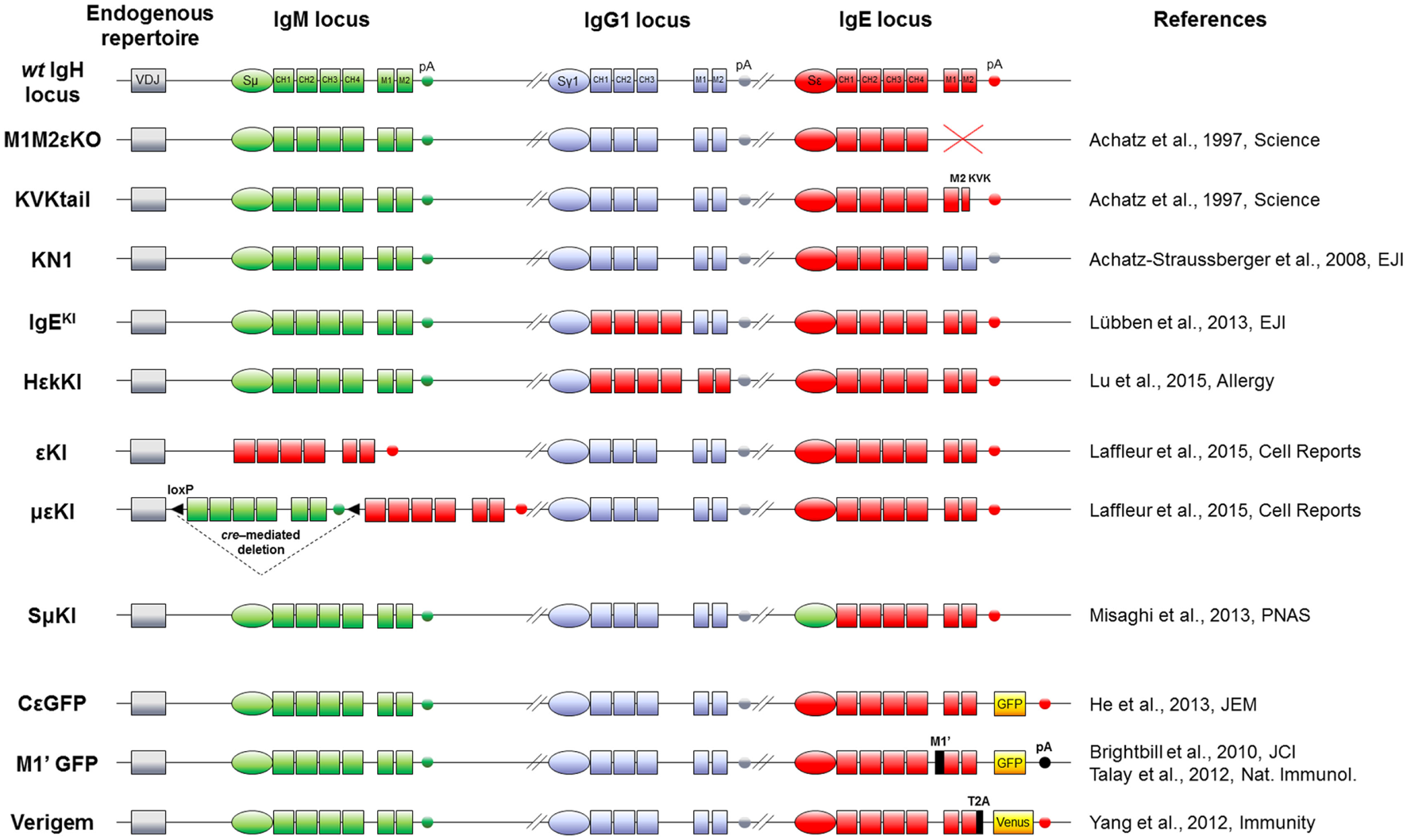 IgH mouse models to study IgE responses in vivo. Top: mouse WT IgH locus is represented after VDJ recombination (not to scale). IgM (green), IgG1 (blue), and IgE (red) loci including their switch regions (S), constant exons (CH), membrane genes (M), and membrane polyadenylation sites (pA) are shown. Middle: knock-out and knock-in alleles are represented, using the color code (IgM elements in green, IgG1 in blue and IgE in red) for modifications of switch regions, exons and polyadenylation sites. Bottom: the three last models feature insertion of fluorescent reporter genes (yellow boxes) and exogenous sequences (black). Name and references of each mouse model are specified on sides.