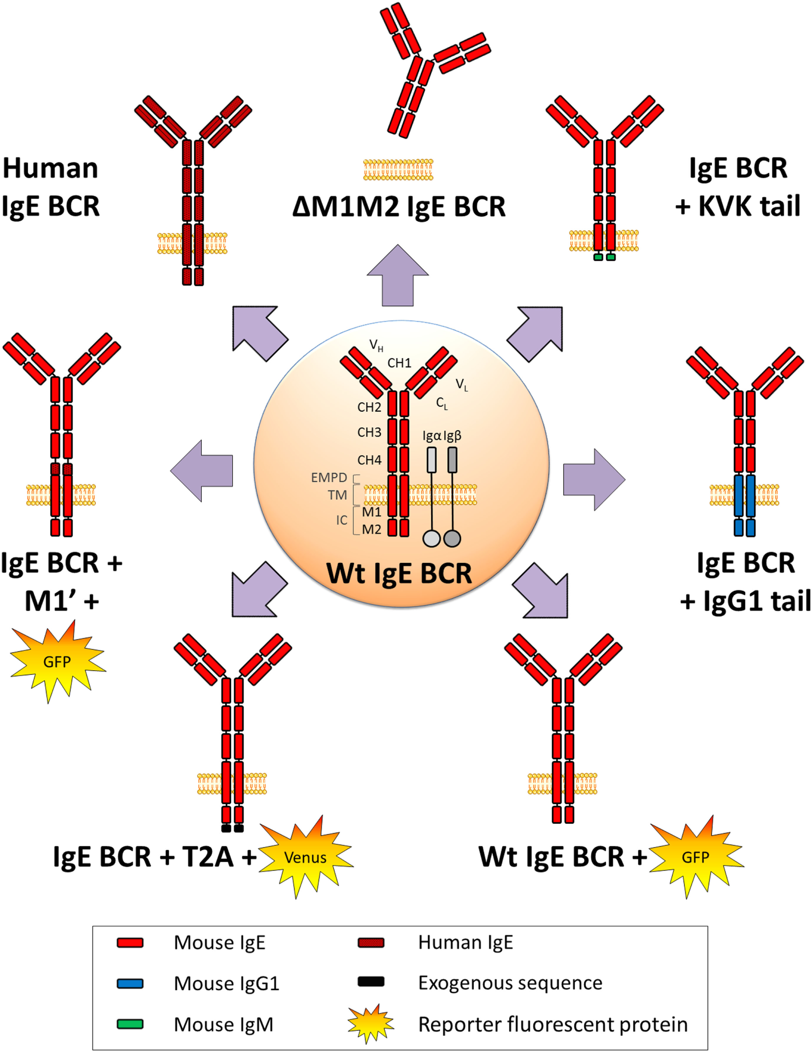 WT and variant IgE B cell receptor (BCR) expressed in mouse models. Mouse WT IgE BCR structure is schematized in the center. Heavy and light chain variable (VH and VL) domains form the antigen-binding site, constant domains (CH), transmembrane (TM), and intracellular domains (IC) are shown, and anchored in the lipid membrane. IgE BCR includes an extra-membrane proximal domain (EMPD). Co-signaling molecules Igα and Igβ are represented in gray. Variant and chimeric IgE BCR resulting from the different knock-in and knock-out alleles (described in Figure 2) are represented, and reporter fluorescent proteins are illustrated.