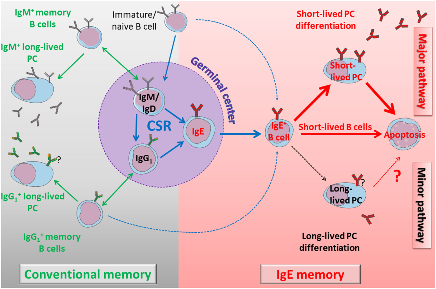 Self-controlled IgE production model. Left part: immature cells differentiate into naïve B cells and could undergo direct class switch recombination (CSR) to IgE or enter into the GC. During the GC reaction, cells can switch directly to IgG1 or IgE, or eventually undergo a sequential switching with an IgG1 intermediate and an extra-follicular CSR to IgE. IgM+ and IgG1+ lymphocytes generate classical humoral memories, with memory B cells and long-lived plasma cells (PCs). These memory B cells can undergo more rounds of GC reaction to increase their antigen (Ag) affinity and to switch to IgG1 or IgE. Direct or sequential CSR produces membrane IgE+ lymphocytes with different Ag affinity, and IgE B cell receptor (BCR) seems to induce a common, short-lived fate. Right part: IgE+ lymphocytes have a bias in short-lived PC differentiation. These short-lived PCs strongly express IgE BCR and undergo massive apoptosis. Membrane IgE+ lymphocytes are also counter-selected by various mechanisms including poor mobility, low membrane IgE expression, and spontaneous apoptosis. Long-lived PCs are very elusive but produce IgE antibodies for a long term, potentially including pathological IgE. A better characterization of these cells and their targeting to eliminate them could lead to new treatments to re-initialize IgE memory and deplete pathological IgE production.
