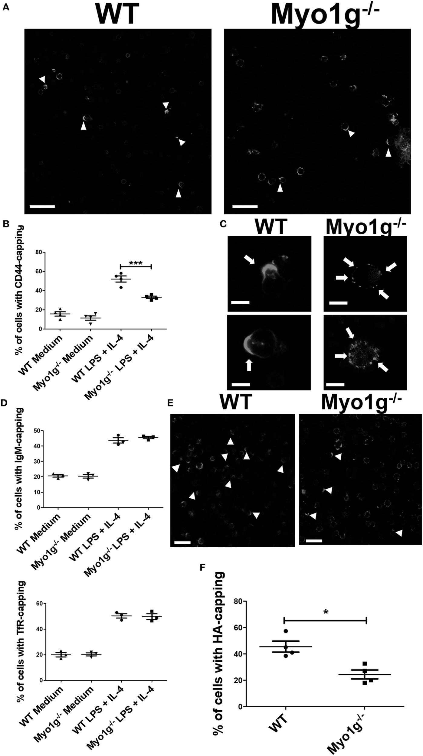 The absence of Myo1g affects the polarization of CD44 in B cells. (A) Confocal images of LPS plus IL4-activated WT or Myo1g−/− B cells. Arrows illustrate CD44 localization in B lymphocytes (scale bar 60 µm). (B) Percentage of cells with CD44-capping (50 cells were counted per experiment in four independent experiments, 200 cells per data set). (C) Enlarged confocal images of LPS plus IL4-activated WT or Myo1g−/− B cells. Arrows illustrate CD44 localization in B lymphocytes (scale bar 5 µm). Graphs of transferrin receptor (TfR), or IgM-capping (50 cells were counted per experiment in three independent experiments, 150 cells per data set). (D) Images of randomly selected files were taken and the percentage of B lymphocytes with capping was calculated (50 cells were counted per experiment in 4 independent experiments, 200 cells per data set). One-way ANOVA tests were used in (B,D) graphs, values are mean ± SD (***P < 0.001). (E) Confocal images of LPS plus IL4-activated from WT or Myo1g−/− B cells. Arrows illustrate hyaluronic acid (HA) localization in B lymphocytes (scale bar 60 µm). (F) Percentage of cells with HA-capping; images of randomly selected files were taken, and the percentage of B lymphocytes with capping was calculated. A total of 200 cells was analyzed. Student’s t-test test was used in this graph, values are mean ± SD (50 cells were counted per experiment, in four independent experiments, 200 cells per data set) (*P < 0.05).
