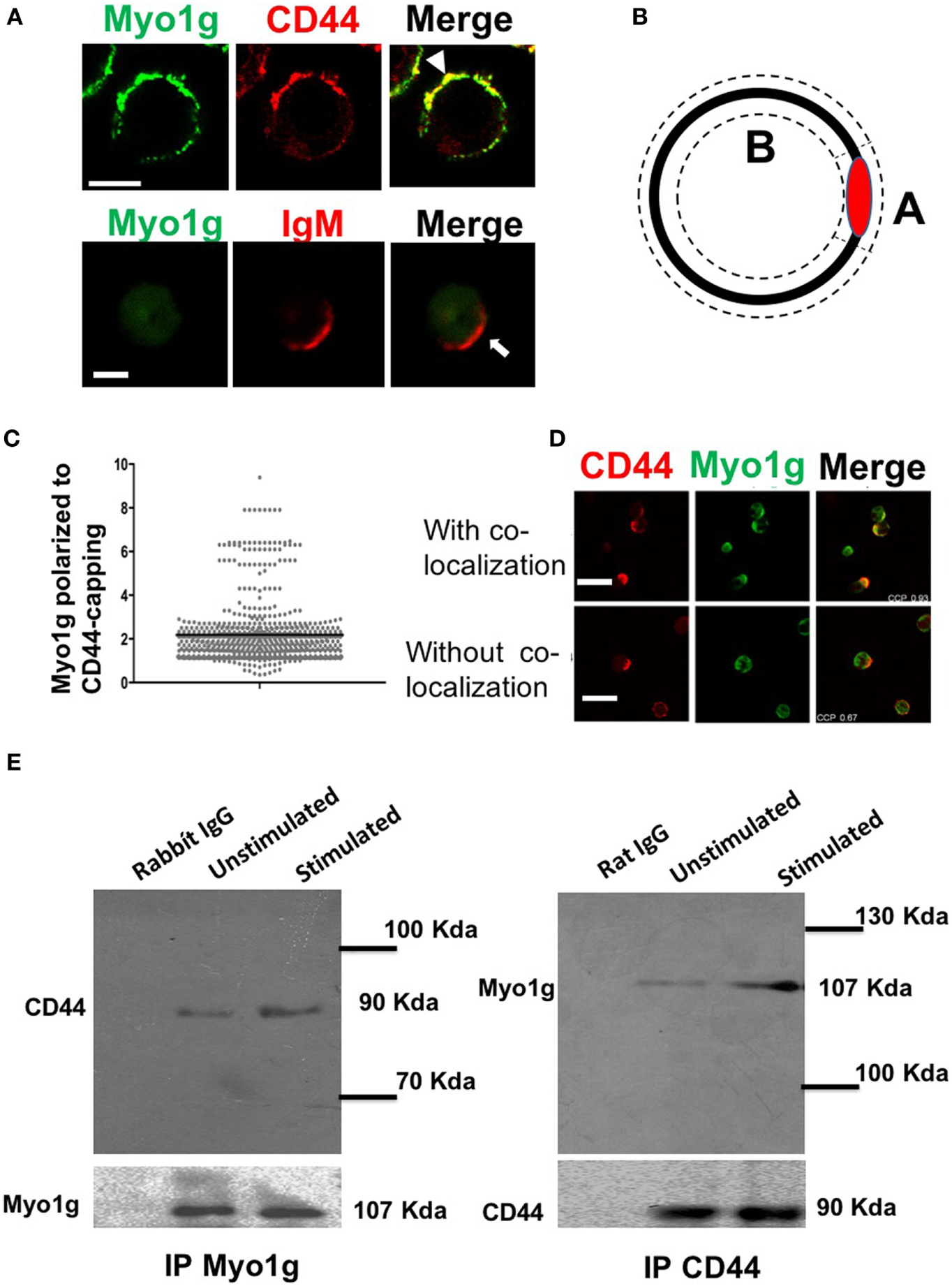 Myo1g is polarized to the capping site of CD44. (A) Confocal images of LPS plus IL4-activated WT or Myo1g−/− B cells. Arrows indicate polarization of Myo1g at the CD44-capping site (scale bar 5 µm). (B) Schematic illustration to calculate the polarization index, where A corresponds to the mean fluorescence intensity (MFI) in the polarized region, and B is the MFI in the rest of the cell. The MFI from A is divided by B. If the value is greater than 1.5, the co-localization is considered positive; values less than 1.5 are considered negative. (C) Polarization coefficient of Myo1g and CD44 derived from the analysis of B lymphocytes (~80 cells were counted per experiment, in 3 independent experiments, 250 cells per data set), values are mean ± SD. (D) Confocal images of B cells with CD44-capping (scale bar 60 µm). (E) Immunoprecipitation with α-Myo1g or α-CD44.