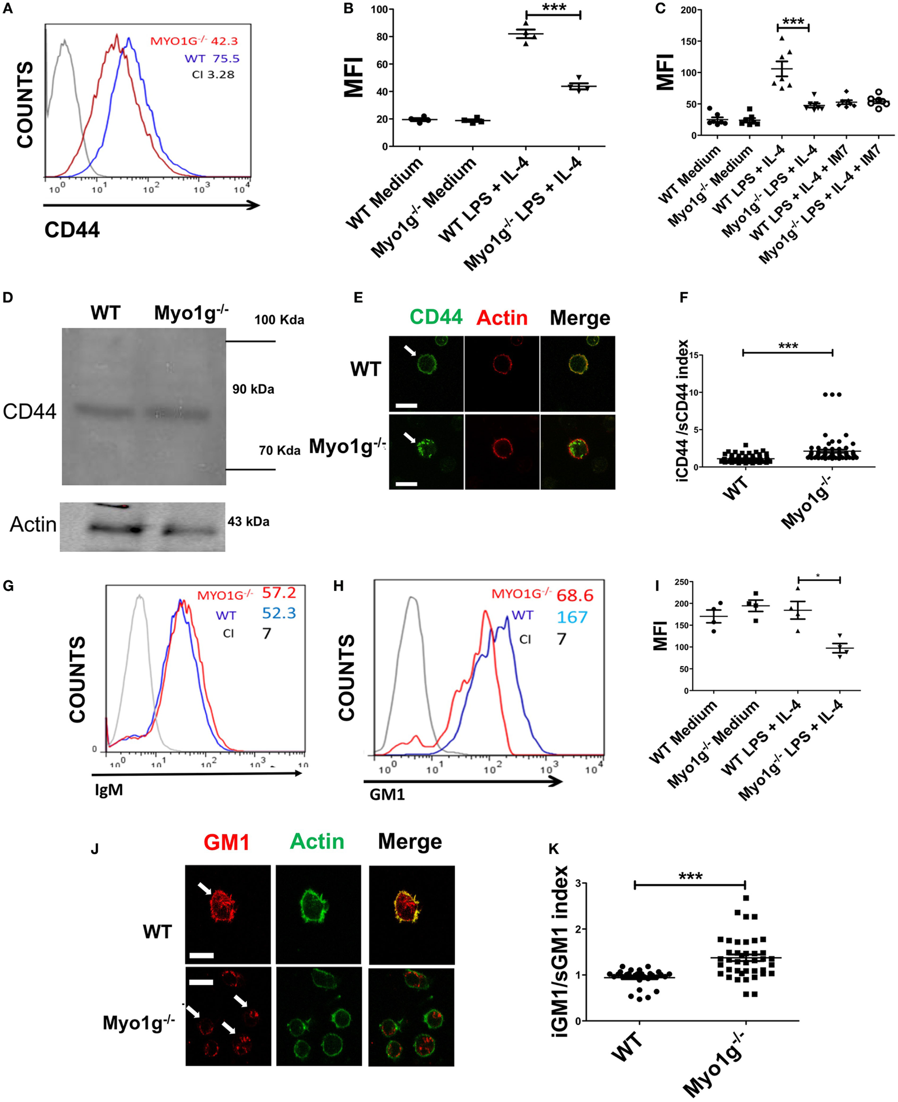 The absence of Myo1g decreases the amount of CD44 and lipid rafts on the surface of B cells. (A) Expression of CD44 in LPS plus IL4-activated B cells from WT or Myo1g-deficient mice. The graph shows the expression of CD44 in B lymphocytes (10,000 events in a gate of B220 + B cells). (B) Expression of CD44 in resting or activated B cells, one-way ANOVA test was used in these experiments, values are mean ± SD (***P < 0.001) (n = 4). (C) Binding of hyaluronic acid (HA-FITC) to resting or LPS plus IL4-activated B lymphocytes from WT or Myo1g-deficient B lymphocytes. HA binding was blocked using the IM7 mAb. One-way ANOVA test was used in these experiments, values are mean ± SD (***P < 0.001) (n = 7). (D) Immunodetection of CD44 in LPS plus IL4-activated B lymphocytes; α-CD44 (clone KM201) was used for western blotting. (E) Confocal images of LPS plus IL4-activated WT or Myo1g−/− B cells. (F) The localization of CD44 as cytosol/plasma membrane index was calculated [mean fluorescence intensity (MFI) in the plasma membrane was divided by MFI in the cytosol] (~30 cells were counted per experiment, in three independent experiments, 100 cells per data set). Student’s t-test was used in these experiments, values are mean ± SD (***P < 0.001). (G) IgM or (H) GM1 in LPS plus IL4-activated B lymphocytes from WT or Myo1g-deficient B cells, the graphs show the expression of GM1 in B lymphocytes (10,000 events in a gate of B220 + B cells). (I) GM1 staining, one-way ANOVA test was used in these experiments, values are mean ± SD (*P < 0.05) (~60 cells were counted per experiment, in four independent experiments, 250 cells per data set). (J) Confocal images of permeabilized LPS plus IL4-activated WT or Myo1g−/− B cells. Arrows indicate the localization of GM1 in B lymphocytes (scale bar 5 µm). (K) Intracellular versus plasma membrane GM1 (~30 cells were counted per experiment, in 3 independent experiments, 100 cells per data set), Student’s t-test was used in these experiments, values are mean ± SD (***P < 0.001).