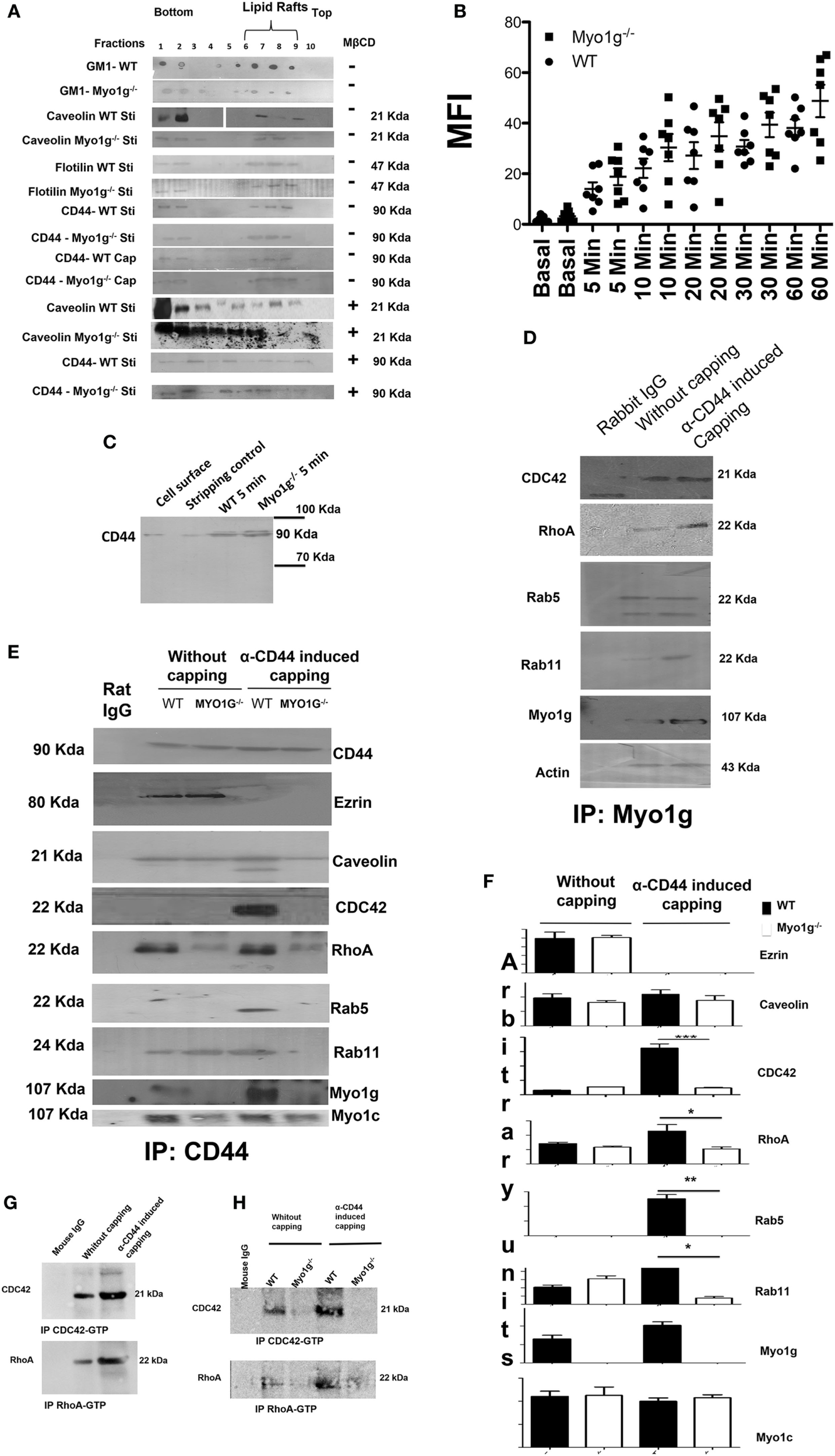 To analyze the participation of Myo1g in the recycling of CD44, immunoprecipitation assays using WT and Myo1g-deficient B cells were performed. A first step involves the migration of CD44 to lipid rafts through association with caveolin, dissociation from ezrin, and recruitment of RhoA and CDC42 to lipid rafts. A second step is defined by the association of the endosome carrying CD44 with Rab5 (early endosome). The third step is the association of this vesicle with Rab11. We demonstrate that the migration of CD44 to lipid rafts was similar between WT and Myo1g-deficient B cells. In addition, recruitment of RhoA and CDC42 was reduced in Myo1g-deficient B cells compared to WT cells. In agreement with this observation, the association of vesicles carrying CD44 with Rab5 was incomplete and there was no association with Rab11 (Figure 5E).