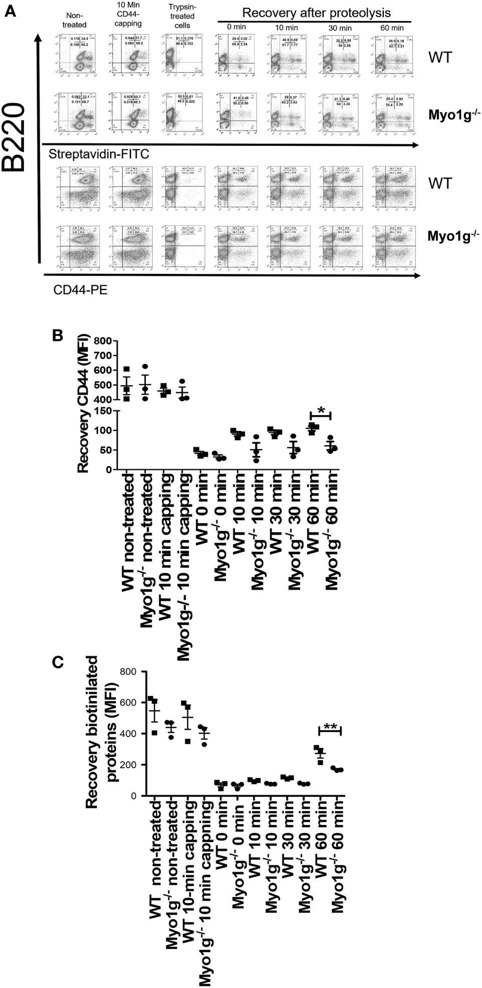 The absence of Myo1g delays the recycling of CD44. (A) Kinetics of CD44-recycling in B lymphocytes from WT or Myo1g-deficient mice. MFI of CD44 (B) or biotinylated proteins (C) in B lymphocytes during the recycling process, One-way ANOVA tests were used in these experiments, values are mean ± SD (*P < 0.05, **P < 0.01) (n = 3).