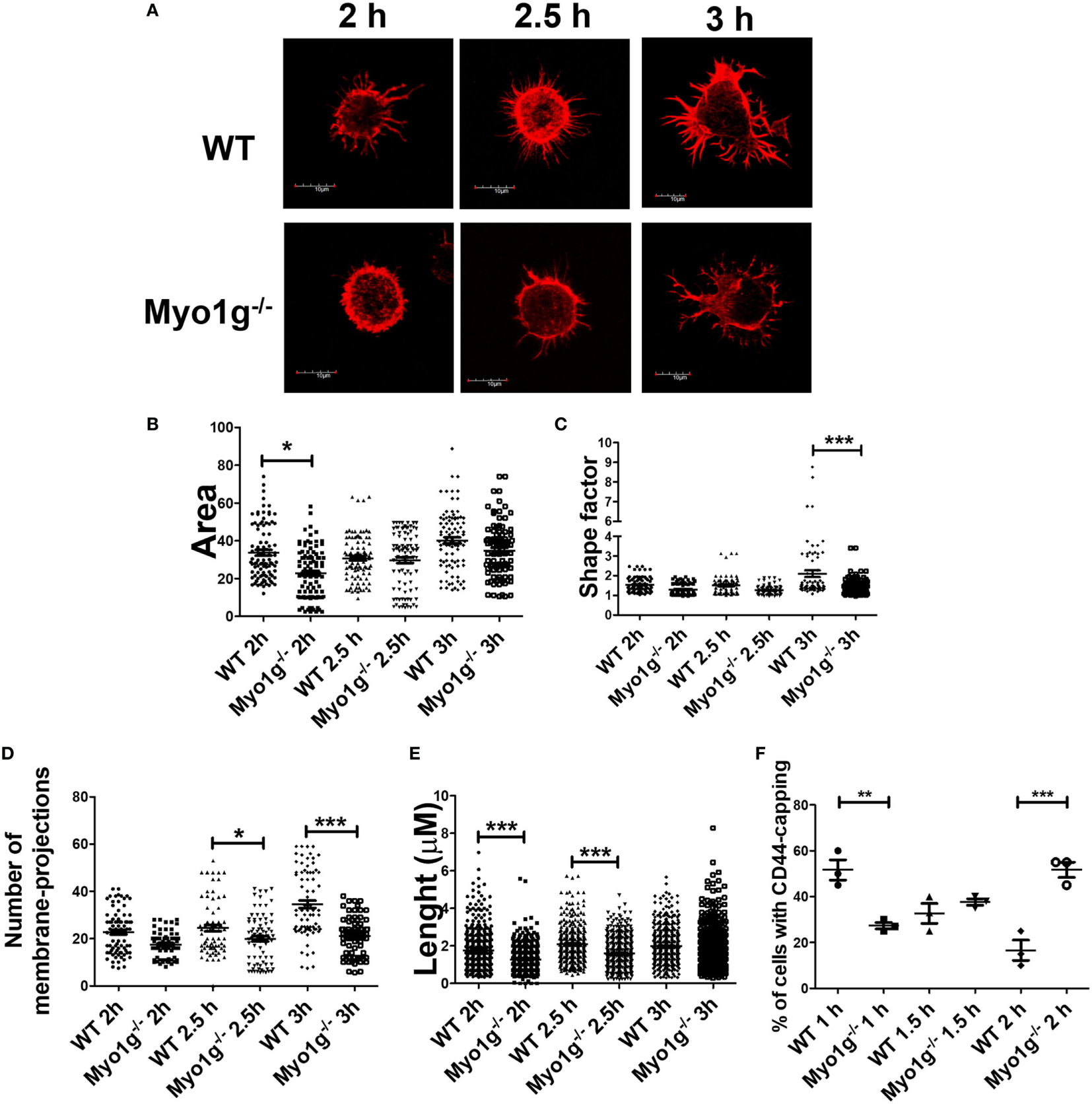 The absence of Myo1g delays the formation of membrane-protrusions in B lymphocytes. (A) Confocal images of activated B cells from WT or Myo1g-deficient mice. B lymphocytes with spread morphology were evaluated for (B) area, (C) shape, (D) number of projections, and (E) the length of these projections after 2, 2.5, and 3 h. A total of 100 cells, in three independent experiments, were analyzed in each group. (F) Percentage of cells with CD44-capping after 1, 1.5, and 2 h. Images of randomly selected files were taken and the percentage of B lymphocytes with capping was recorded (~70 cells were analyzed in 3 independent experiments, a total of 200 cells per data set are presented). One-way ANOVA tests were used in these experiments, values are mean ± SD (*P < 0.05, **P < 0.01, ***P < 0.001).