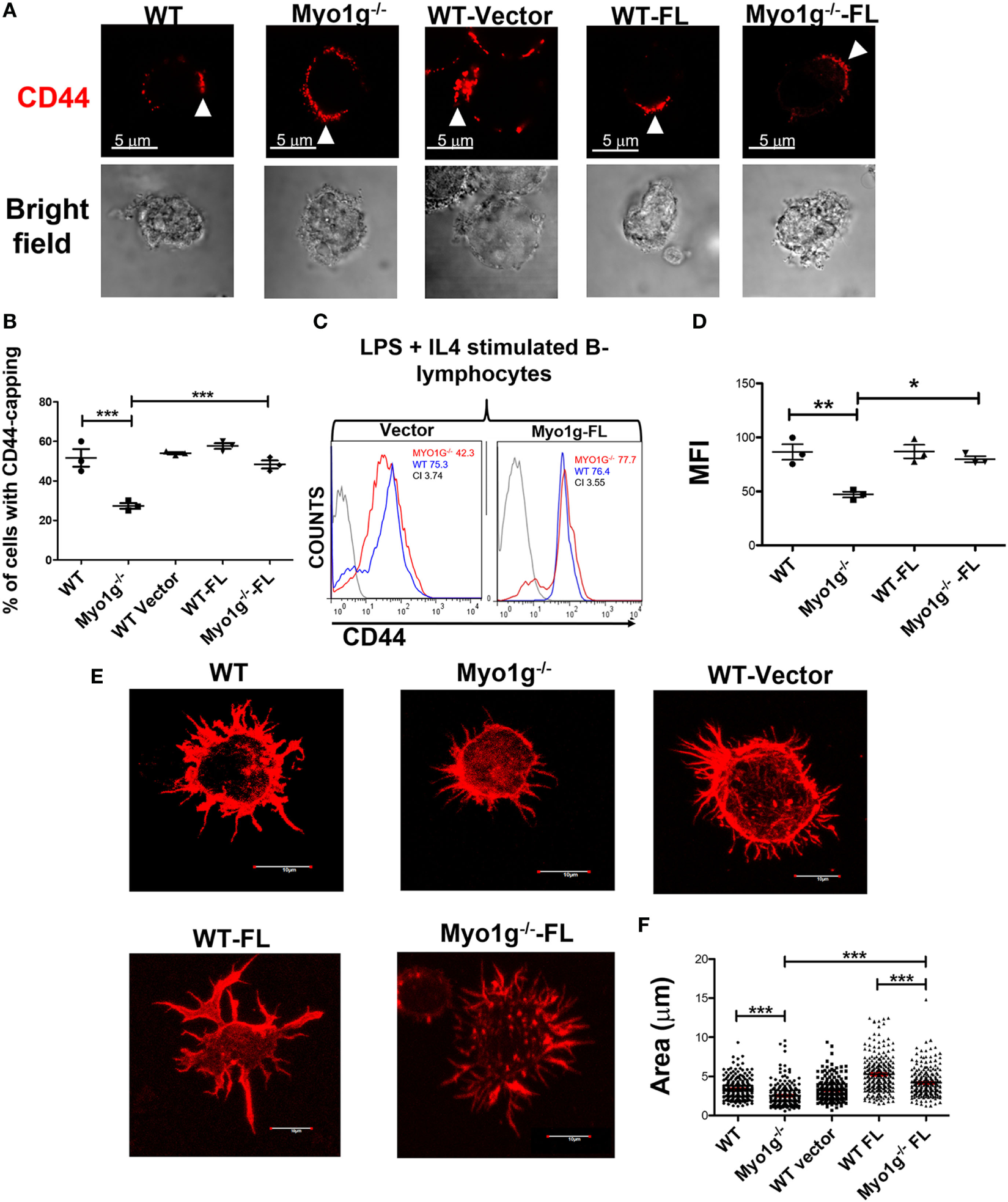 Transfection with full-length Myo1g rescue CD44-dependent capping and spreading in Myo1g-deficient B-cells. (A) Confocal images of LPS plus IL4-activated B cells from WT, Myo1g−/−, WT, or Myo1g−/− transfected with an empty vector or Myo1g-FL. Arrows illustrate the localization of CD44 in B lymphocytes (scale bar 5 µm). (B) Percentage of cells with CD44-capping. Images of randomly selected files were taken and the percentage of B lymphocytes with capping was calculated. A total of 200 cells per data set from three independent experiment were analyzed. One-way ANOVA test was used in these experiments, values are mean ± SD (***P < 0.001) (n = 3). (C) Representative expression of CD44 in LPS plus IL4-activated B cells transfected or not with Myo1g-FL from WT or Myo1g-deficient B lymphocytes, the graph shows the expression of CD44 in B lymphocytes (10,000 events in a gate of B220 + B cells). (D) Expression of CD44 in LPS plus IL4-activated B cells transfected or not with Myo1g-FL from WT or Myo1g-deficient B lymphocytes. One-way ANOVA test was used in these experiments, values are mean ± SD (* P < 0.05, **P < 0.01) (n = 3). (E) Confocal images of activated B cells from WT or Myo1g-deficient mice over NIMR8. (F) The area of spread B lymphocytes was evaluated, a total of 150 cells per data set from three independent experiments were analyzed. One-way ANOVA test was used in these experiments, values are mean ± SD (***P < 0.001).