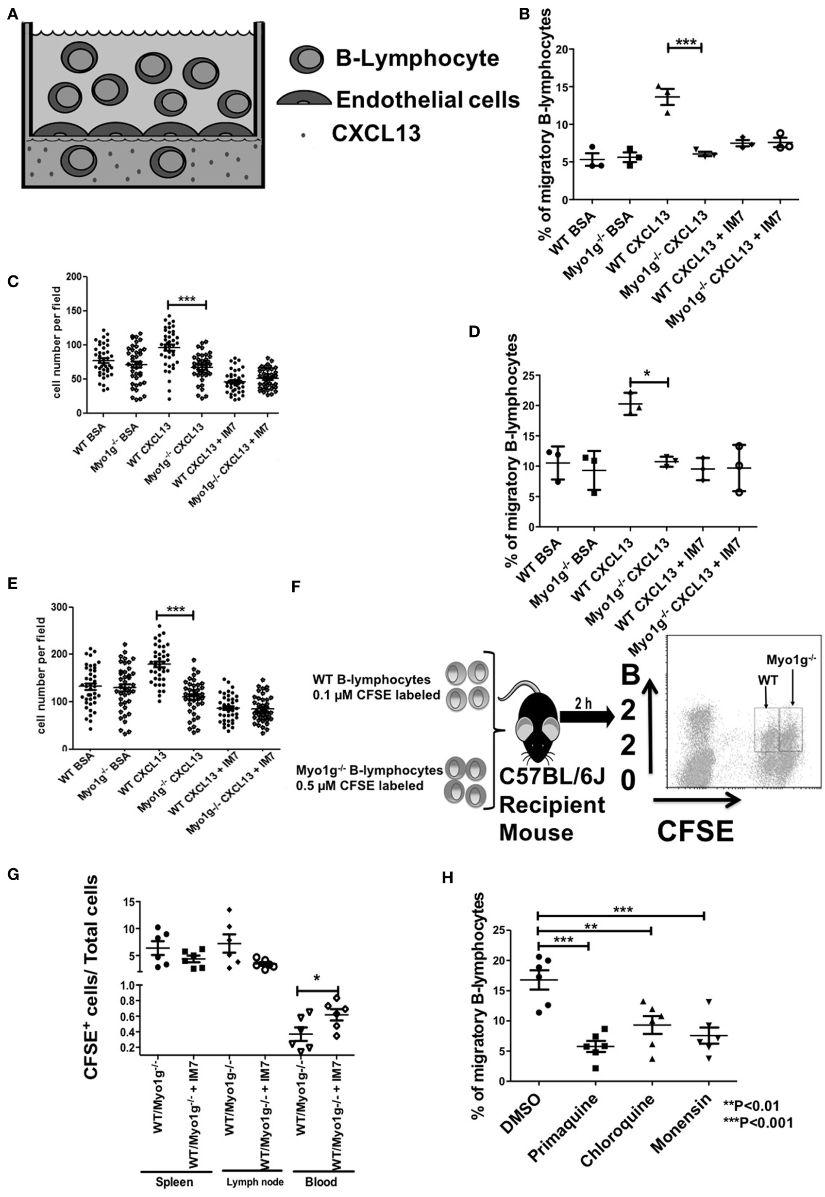 CD44-dependent migration was then evaluated in more physiological settings, using transendothelial cell migration and in vivo homing assays. These methods are illustrated in Figures 10A,F, respectively. In some cases, we performed the same pretreatment with α-CD44 clone IM7 to evaluate the role of CD44 in this physiologic process. In the transendothelial migration assays, the Myo1g-deficient B cells demonstrated reduced migration in response to a CXCL13 gradient, compared with WT B lymphocytes. Pretreatment with IM7 antibody reduced the migration of WT B cells (Figure 10B), demonstrating the role of CD44 in this process. Simultaneously, the number of cells per field, in the filter containing the endothelial monolayer, was quantified. Less Myo1g−/− B cells adhered to the monolayer, and the adhesion was CD44-dependent as was shown by the inhibition observed with the IM7 antibody (Figure 10C). The experiments described above were performed using resting B cells. We, therefore, repeated these studies using LPS plus IL-4 activated B cells, the results become like those observed with resting B cells (Figures 10D,E).