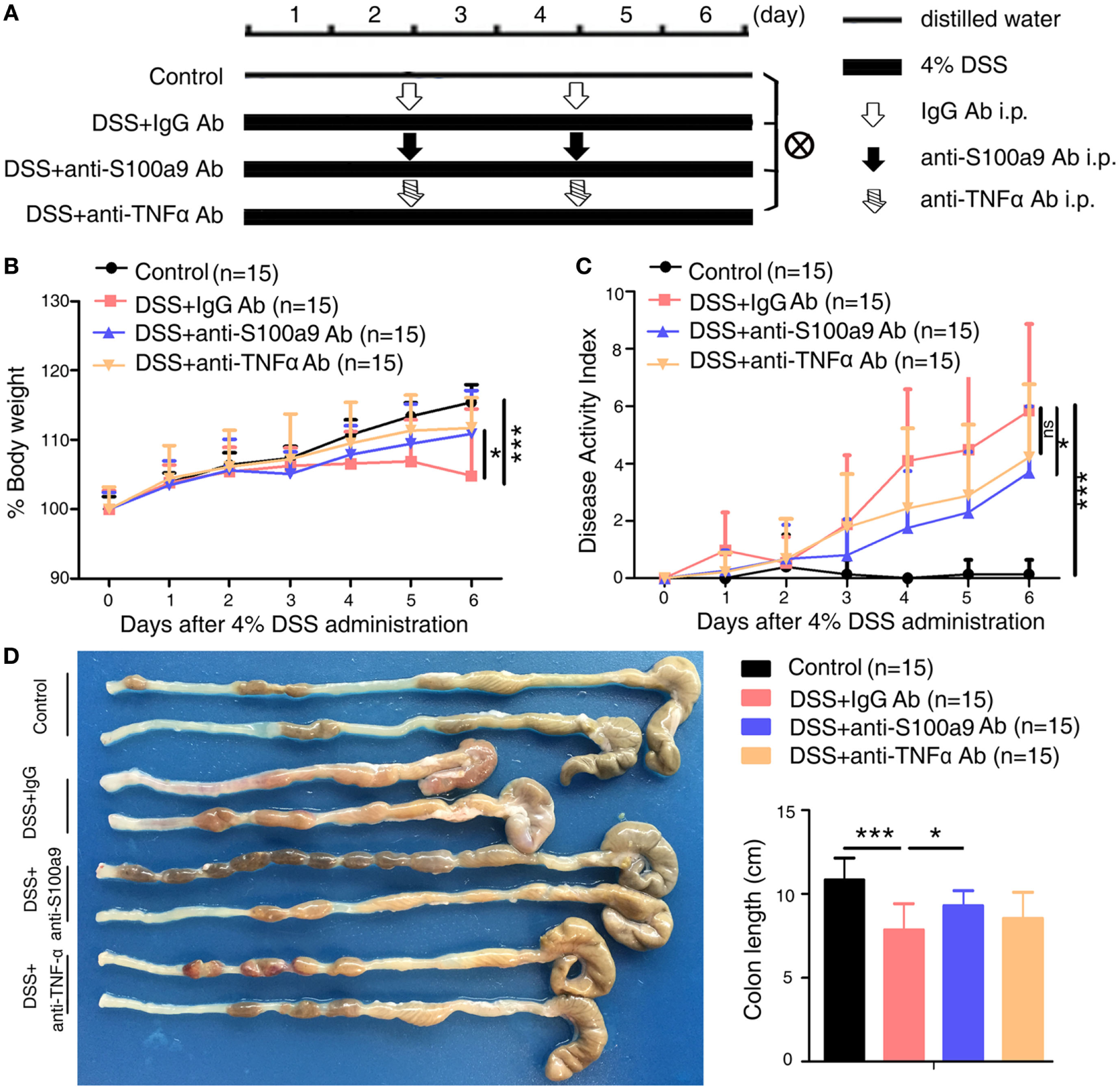 Therapeutic effects of anti-S100a9 Ab treatment on dextran sulfate sodium (DSS)-induced acute colitis in mice. (A) ICR mice received either 4% DSS-containing or distilled water alone (Control) for 6 days. DSS-treated mice were injected intraperitoneally with either negative control IgG or anti-S100a9 Ab, or anti-tumor necrosis factor alpha (TNFα) Ab at a dose of 1.5 and 5 mg/kg, respectively, on days 2 and 4; n = 15 per group. (B) Change in body weight over time was expressed as the percentage of the initial body weight. (C) The disease activity index (DAI) was measured every day; DAI = weight loss score + stool characters score + hematochezia score. (D) The colon length was measured at day 6. Student’s t-test, error bars represent SD. *p < 0.05, **p < 0.01, and ***p < 0.001, ns, non-significant.