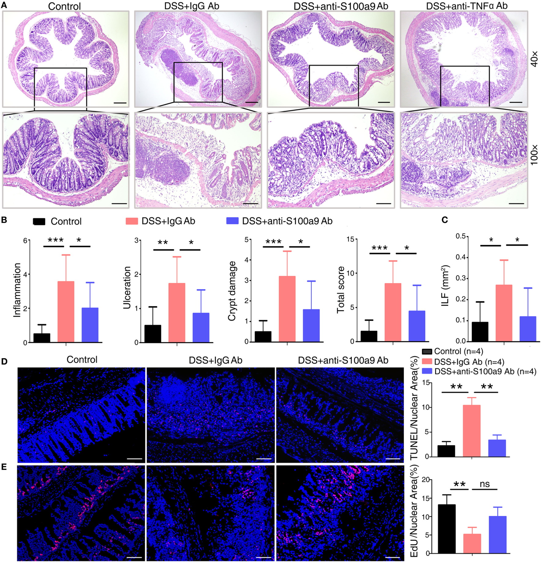 Anti-S100a9 Ab ameliorates inflammatory response of dextran sulfate sodium (DSS)-induced colitis in mice. (A) 6 days after DSS treatment, representative H&E-stained colon sections were shown (upper panels: original magnification 40×, scale bar: 200 µm; lower panels: original magnification 100×, scale bar: 100 µm). (B) Colon inflammation, ulceration, and crypt damage were scored individually, and composite total score was scored. n = 5 per group. (C) Isolated lymphoid follicles (ILFs) area was measured at day 6. Representative TUNEL staining (D) and ethynyl-2′-deoxyuridine (EdU) staining (E) of normal mice and DSS-induced mice, which were treated with IgG Ab or anti-S100a9 Ab on day 6. The percent of positive cells was measured. At least six fields were counted per mouse. Scale bar, 100 µm.