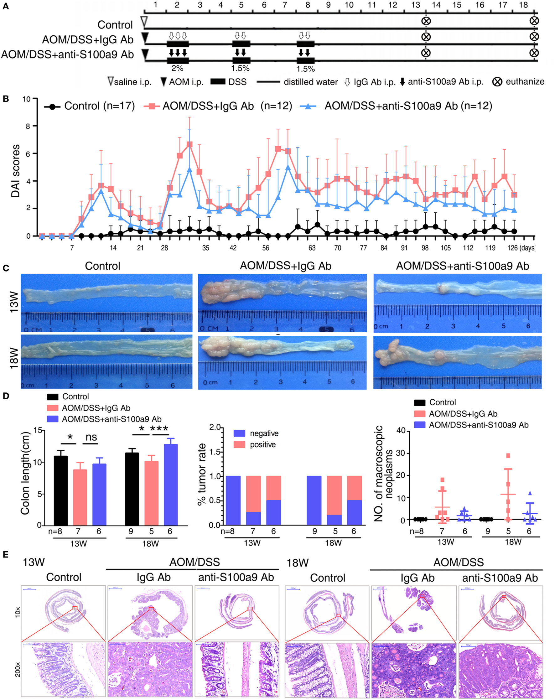 Effects of anti-S100a9 Ab administration on the azoxymethane (AOM)/dextran sulfate sodium (DSS)-induced colitis-associated cancer development. (A) Experimental procedure of the control group and the AOM/DSS group treated with IgG Ab or anti-S100a9 Ab. (B) DAI of the IgG Ab or anti-S100a9 Ab-treated AOM/DSS mice and normal controls. (C) General observation of the colorectums in mice at the end of the 13th and 18th week. (D) Colon length, tumor rate, and number of macroscopic neoplasms were statisticed at 13 and 18 weeks, individually. n = 5–9 per group. Results were representative of the three experiments performed. (E) Histopathological examination of colon sections was shown under the Pannoramic Viewer (H&E staining, upper panels: original magnification 10×, scale bar: 2000 µm; lower panels: original magnification 200×, scale bar: 100 µm).