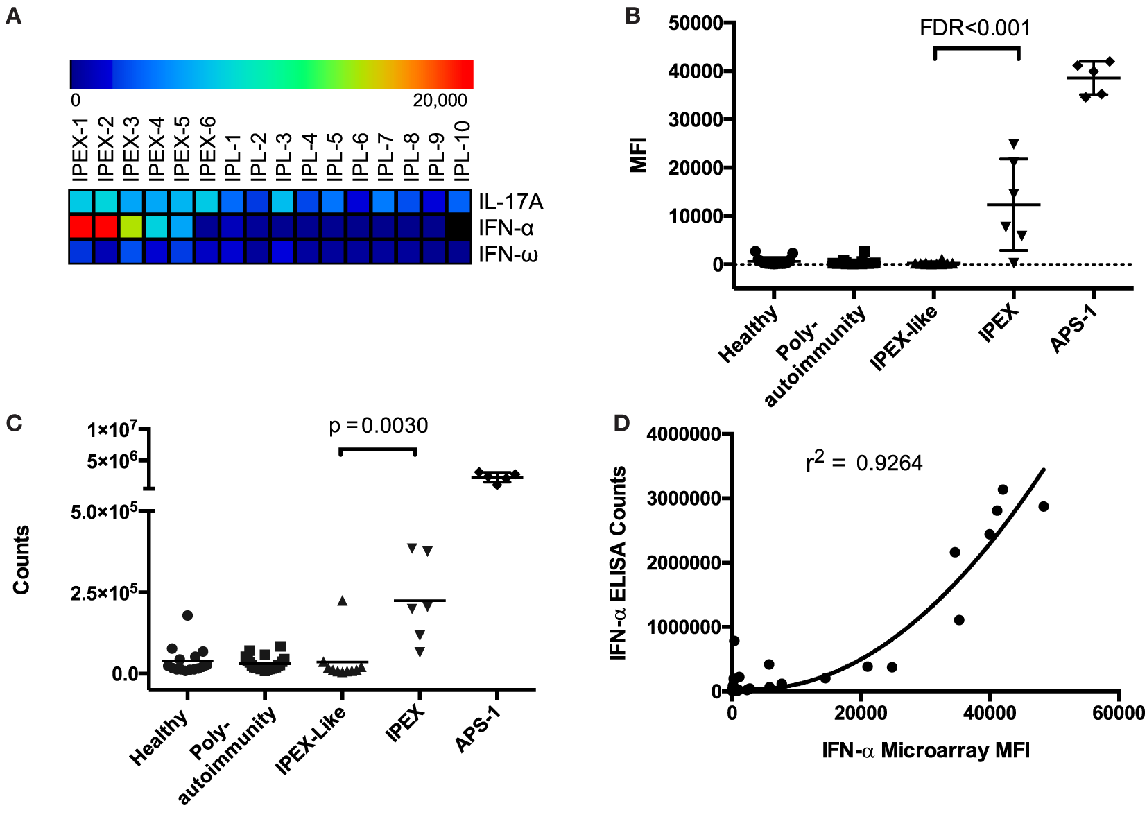 Antigen microarrays identify anti-cytokine autoantibodies (ACAAs). (A) Significance analysis of microarrays identifies ACAAs enriched in immunodysregulation polyendocrinopathy enteropathy X-linked (IPEX) compared to IPEX-like disease (IPL) (false discovery rates <0.001). (B) ACAA mean fluorescence intensity values against interferon-α (IFN-α) in all patients studied as measured by antigen microarray. (C) ACAA counts against IFN-α in all patients studied as measured by indirect immunoassay (p = 0.003 Mann–Whitney) (D) Correlation of IFN-α ACAA values as measured by microarray compared to indirect immunoassay (r2 = 0.924 using quadratic regression).