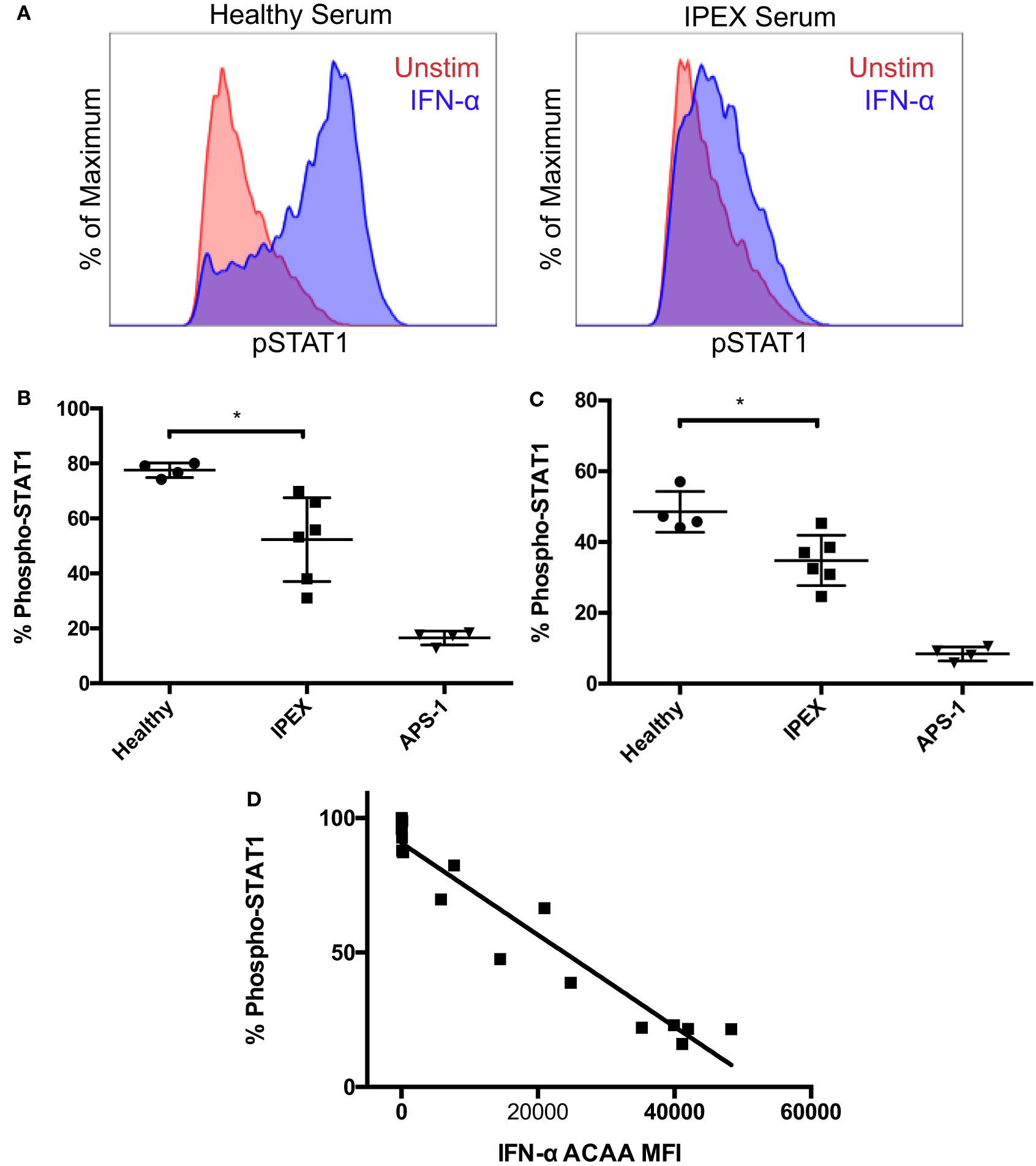 Blocking activity of interferon-α (IFN-α) ACAAs. (A) Aliquots of a healthy donor’s PBMCs were incubated with serum and either stimulated with IFN-α or left unstimulated. Representative flow cytometry plots measuring STAT1 phosphorlyation in CD4+ gated T cells are shown. (B) Percent of CD4+ T cells gated for STAT1 phosphorylation after IFN-α stimulation in the presence of healthy, IPEX, or autoimmune polyendocrine syndrome type I sera (p = 0.012) or (C) IgG purified from sera (p = 0.013). Unpaired t-test. (D) Correlation between IFN-α ACAA reactivity and blocking activity (p < 0.001, r2 = 0.925), linear regression.