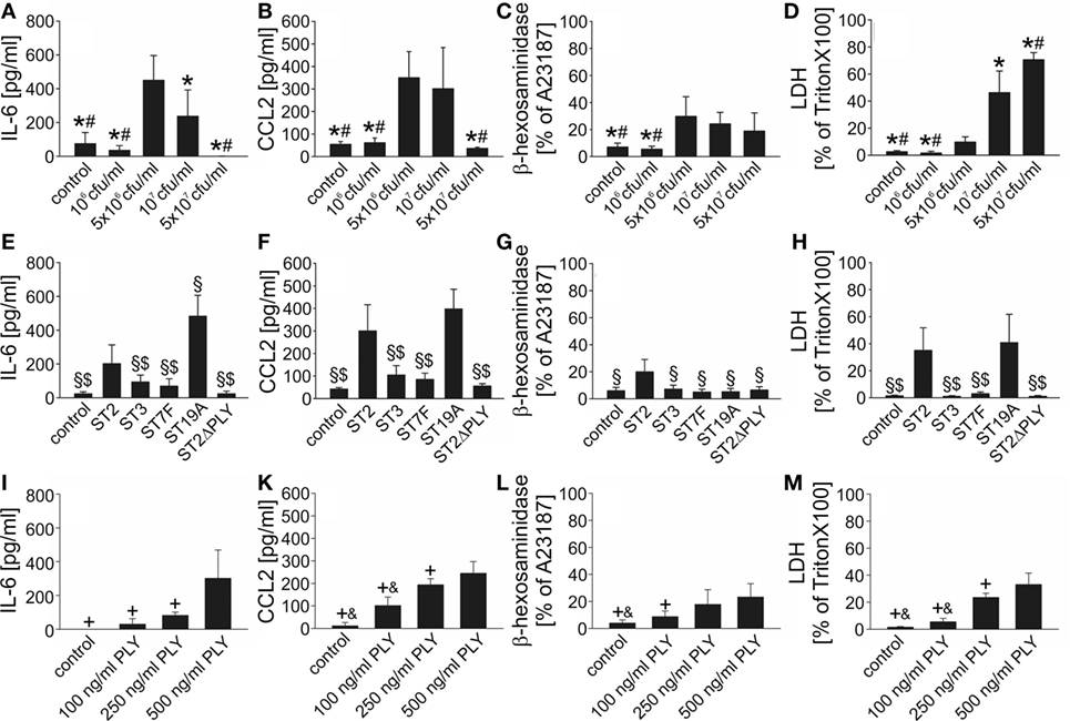 Figure 1. Mouse bone marrow-derived mast cells (BMMC) are activated upon exposure to Streptococcus pneumoniae in vitro. To get first insight into the role of mast cells in S. pneumoniae infection, we analyzed responsiveness of mouse BMMC toward pneumococcal challenge using different S. pneumoniae concentrations (A–D), serotypes (E–H), and different recombinant pneumolysin (PLY) concentrations (I–M). Supernatants were collected 6 h after challenge, and interleukin (IL)-6 (A,E), CCL2 (B,F), β-hexosaminadase (C,G), and LDH (D,H) contents were analyzed by standard assays. For β-hexosaminadase release measurements, the calcium ionophore A23187 served as positive control (PC). For LDH determinations, BMMC lysed by Triton X-100 were used as PCs. Controls received THY instead of S. pneumoniae. Abbreviations: ST, serotype; cfu, colony forming units. All experiments were—at least—carried out thrice in duplicates. Data are given as means ± SD. *P < 0.05, compared with 5 × 106 cfu/ml S. pneumoniae ST2; #P < 0.05, compared with 107 cfu/ml S. pneumoniae ST2; §P < 0.05, compared with 107 cfu/ml S. pneumoniae ST2; $P < 0.05, compared with 107 cfu/ml S. pneumoniae ST19A; +P < 0.05, compared with 500 ng/ml PLY, and &P < 0.05, compared with 250 ng/ml PLY, using ANOVA and Student–Newman–Keuls test for post hoc analysis.