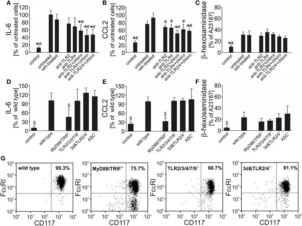 Figure 2. Bone marrow-derived mast cells (BMMC) activation in response to Streptococcus pneumoniae challenge occurs independently of toll-like receptors (TLR) signaling. To evaluate the role of TLR in S. pneumoniae–BMMC interaction, we assessed the responsiveness of BMMC to pneumococcal challenge (107 cfu/ml) in the absence or presence of different TLR antagonists (including blocking antibodies directed against TLR2 or TLR4 and the endosomal TLR antagonist chloroquine). BMMC from mice with deficiencies in TLR signaling (including MyD88/TRIF-, TLR2/3/4/5/7/9-, and 3d&TLR2/4-deficent mice) or in the inflammasome component ASC were used in additional experiments. Supernatants were collected 6 h after challenge, and interleukin (IL)-6 (A,D), CCL2 (B,E), and β-hexosaminadase (C,F) levels were analyzed by standard assays. To determine the differentiation state of BMMC, cells sampled 6 weeks after the start of culture were subjected to immunophenotyping by flow cytometry using FcεRI and CD117 antibodies (G). All experiments were—at least—carried out twice in triplicates. Data are given as means ± SD. *P < 0.05, compared with untreated, stimulated BMMC; #P < 0.05, compared with vehicle (combination of isotype antibodies plus sterile deionized water, the vehicle of chloroquine)-treated, stimulated BMMC; and §P < 0.05, compared with stimulated wild-type BMMC, using ANOVA and Student–Newman–Keuls test for post hoc analysis.