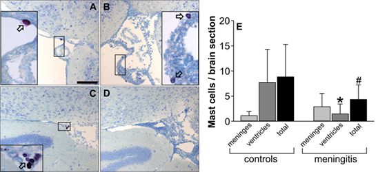 Figure 3. Central nervous system mast cell numbers are reduced during murine pneumococcal meningitis. The images show representative toluidine blue-stained brain sections from control mice (A,C) and mice subjected to pneumococcal meningitis (B,D). Images (A,B) show cutouts of the leptomeningeal space, whereas (C,D) show cutouts of the ventricles. Mast cells stain purple with toluidine blue; arrows indicate representative mast cells. The number of toluidine blue-positive cells was determined in 10 brain sections containing lateral ventricles and the dentate gyrus (thereby focusing on the leptomeningeal space and ventricles) and given as n per brain section (E). Scale bars: 100 µm. Data are given as means ± SD. *P < 0.05, compared with the number of mast cells within the ventricles in control mice; #P < 0.05, compared with the total number of mast cells in control mice, using Mann–Whitney rank sum test.