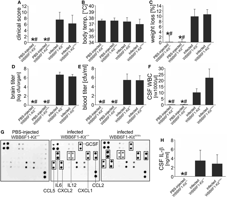 Figure 4. WBB6F1-KitW/Wv mice are fully susceptible to pneumococcal meningitis. Pneumococcal meningitis was induced by intracisternal injection of Streptococcus pneumoniae. Eighteen hours later, animals were evaluated. Except of increased cerebrospinal fluid (CSF) white blood cell (WBC) counts (F), WBB6F1-KitW/Wv mice showed a similar disease phenotype as WBB6F1-Kit+/+ mice, as evidenced by similar clinical score values (A), body temperatures (B), weight losses (C), and brain and blood bacterial titers (D,E). The increase in CSF WBC counts was not associated with increased expression of inflammatory mediators within the central nervous system, as shown by protein array analyses on brain homogenates (G) and interleukin (IL)-1β ELISA on CSF samples (H). Data are given as means ± SD. *P < 0.05, compared with infected WBB6F1-Kit+/+ mice; #P < 0.05, compared with infected WBB6F1-KitW/Wv mice, using ANOVA and Student–Newman–Keuls post hoc test.