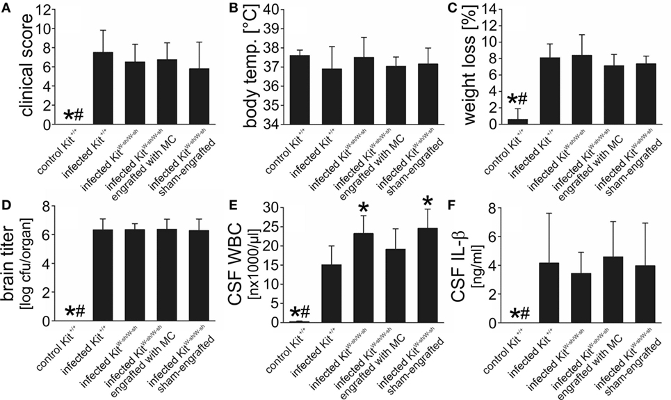 Figure 5. C57BL/6 KitW-sh/W-sh mice show a similar disease phenotype of pneumococcal meningitis than their respective wild-type (WT) littermates. Pneumococcal meningitis was induced by intracisternal injection of Streptococcus pneumoniae. Eighteen hours later, animals were evaluated. Except of increased cerebrospinal fluid (CSF) white blood cell (WBC) counts, C57BL/6 KitW-sh/W-sh mice showed a similar disease phenotype as their WT controls C57BL/6 Kit+/+ mice, as evidenced by similar clinical score values (A), body temperatures (B), weight losses (C), and brain bacterial titers (D). The increase in CSF WBC counts (E) was not associated with increased CSF concentrations of interleukin (IL)-1β, as shown by ELISA analysis (F). When injected intracisternally with phosphate-buffered saline, C57BL/6 KitW-sh/W-sh mice had CSF WBC numbers (0.33 ± 0.28 × 103 cells/μl) equal to that of C57BL/6 Kit+/+ mice. Data are given as means ± SD. *P < 0.05, compared with infected C57BL/6 Kit+/+ mice; #P < 0.05, compared with infected C57BL/6 KitW-sh/W-sh mice, using ANOVA and Student–Newman–Keuls post hoc test.