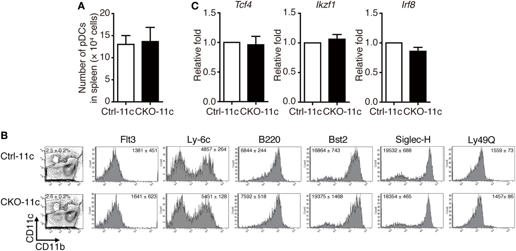 Comparable plasmacytoid dendritic cell (pDC) development in CKO-11c mice and Ctrl-11c mice. (A) pDC numbers in the spleen of Ctrl-11c and CKO-11c mice were enumerated. (B) Flow cytometric analysis showing the expression of various pDC maturation markers in CD11b−CD11c+ bone marrow cells isolated from Ctrl-11c or CKO-11c mice. The frequency of the CD11bCD11c+ population and the mean fluorescence intensity of the staining in each histogram are indicated. (C) RT-quantitative PCR showing the mRNA expression levels of E2-2 (Tcf4), Ikaros (Ikzf1), and IRF8 in splenic pDCs isolated from Ctrl-11c or CKO-11c mice. Results represent the mean ± SEM and were analyzed by two-tailed unpaired Student’s t-test [n = 3 in (A−C)].