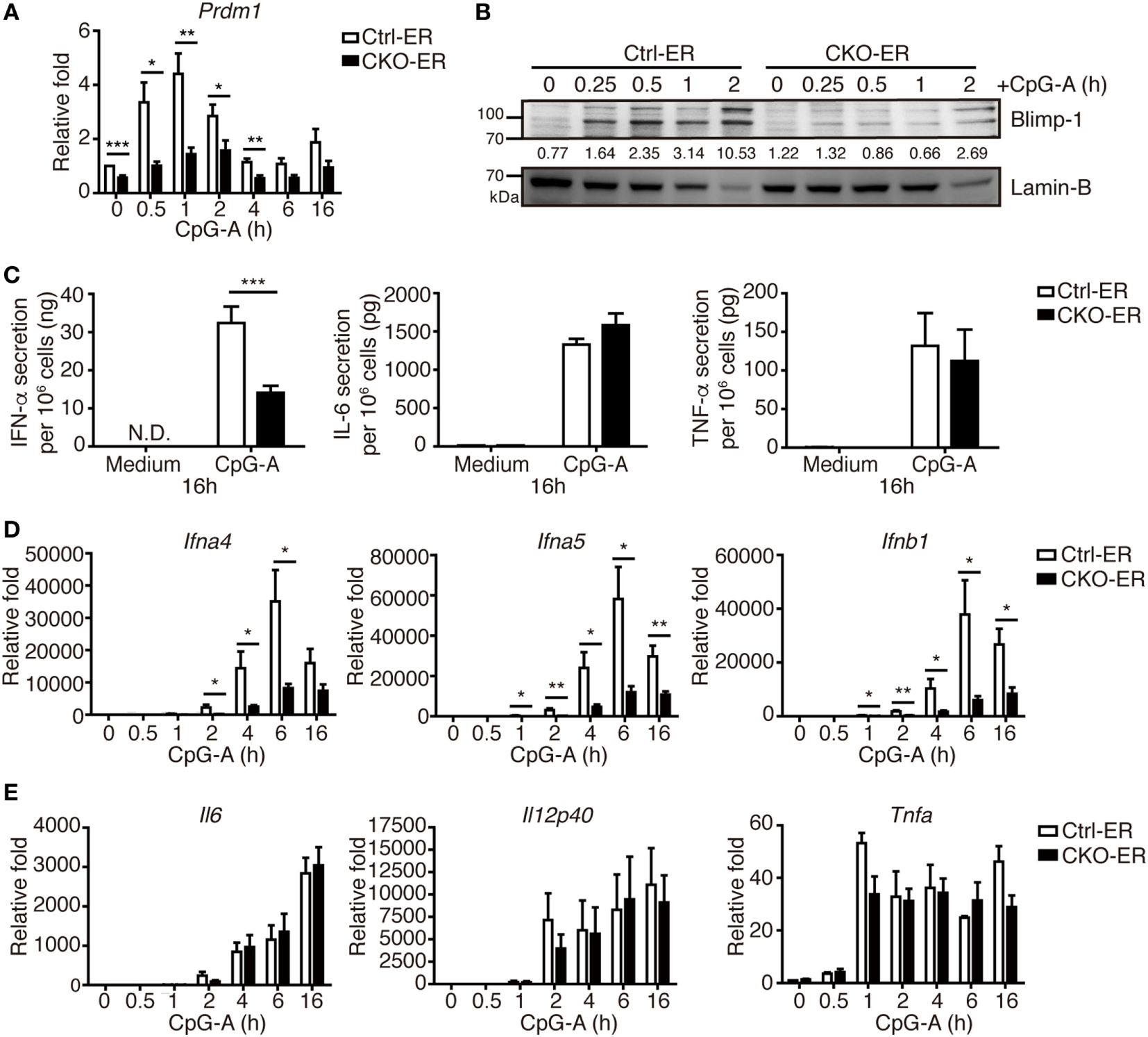 Inducible deletion of Prdm1 confirmed the important role of Blimp-1 in type I IFN (IFN-I) production in plasmacytoid dendritic cells (pDCs). (A,B) RT-quantitative PCR (RT-qPCR) (A) and immunoblotting (B) showing Blimp-1 mRNA and protein levels in FLpDCs from Ctrl-ER and CKO-ER mice treated with 500 nM 4-OHT and then stimulated with 1 µM CpG-A at indicated time points. The quantitation of Blimp-1 in (B) was presented by the ratios of Blimp-1 band intensity vs. Lamin-B band intensity at each time point. (C) 4-OHT treated FLpDCs cultured from Ctrl-ER and CKO-ER mice were stimulated with 1 µM CpG-A or medium alone for 16 h, followed by ELISA to measure the levels of IFN-α, IL-6, and TNF-α production. (D,E) RT-qPCR showing mRNA levels of IFN-I (D) and proinflammatory cytokines (E) in 4-OHT treated FLpDCs from Ctrl-ER and CKO-ER mice after stimulation with 1 µM CpG-A at indicated time points. Data represent the mean ± SEM and were analyzed by two-tailed unpaired Student’s t-test [n = 6 in (A), 3 in medium, 9−14 in CpG-A treatment in (C), 7 in (D), and 3−4 in (E)]. *p < 0.05; **p < 0.01; ***p < 0.001.