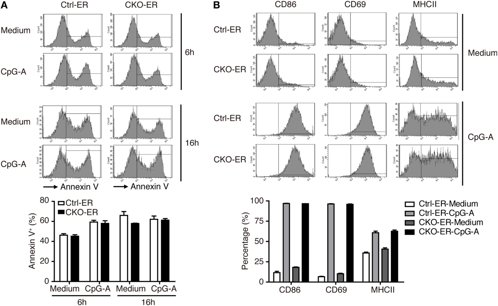 Activation and apoptosis were not affected in Blimp-1-deficient FLpDCs. (A) Flow cytometric analysis showing the frequency of Annexin V positive cells in 4-OHT treated Ctrl-ER or CKO-ER FLpDCs stimulated with 1 µM CpG-A or medium alone for 6 and 16 h. (B) Flow cytometric analysis of CD86, CD69, and MHCII expression on 4-OHT treated Ctrl-ER or CKO-ER FLpDCs with or without 16 h of 1 µM CpG-A stimulation. The positive frequency of each marker is indicated. Results represent the mean ± SEM and were analyzed by two-tailed unpaired Student’s t-test [n = 3 in (A,B)].