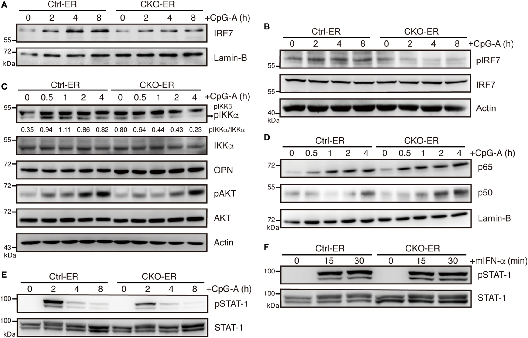 Impaired IKKα and IRF7 activation in plasmacytoid dendritic cells (pDCs) with reduced Blimp-1 expression. (A) Immunoblot analysis of nuclear extracts showing the levels of IRF7 in 4-OHT treated Ctrl-ER and CKO-ER FLpDCs following stimulation with 1 µM CpG-A at indicated time points. (B) Immunoblot analysis of total cell lysates showing the levels of IRF7 phosphorylation at Ser471/472 in 1 µM CpG-A stimulated Ctrl-ER and CKO-ER FLpDCs. (C) Immunoblot analysis showing the levels of phospho-IKKα at Ser176/180, OPN and phospho-AKT at Ser473, in 4-OHT treated and CpG-A stimulated Ctrl-ER and CKO-ER FLpDCs. The quantification of pIKKα was presented by the ratios of pIKKα band intensity vs. IKKα band intensity at each time point. (D) Immunoblot analysis using nuclear extracts of 4-OHT treated Ctrl-ER and CKO-ER FLpDCs showing the levels of p50 and p65 translocation after 1 µM CpG-A treatment at indicated time points. (E) Immunoblot analysis showing the levels of phosphorylated STAT1 at Tyr701 at the indicated time points in Ctrl-ER and CKO-ER FLpDCs treated with 4-OHT and then stimulated with 1 µM CpG-A at the indicated time points. (F) Immunoblot analysis showing levels of phosphorylated STAT1 at Tyr701 in FLpDCs in the presence of 500 U/ml mIFN-α.