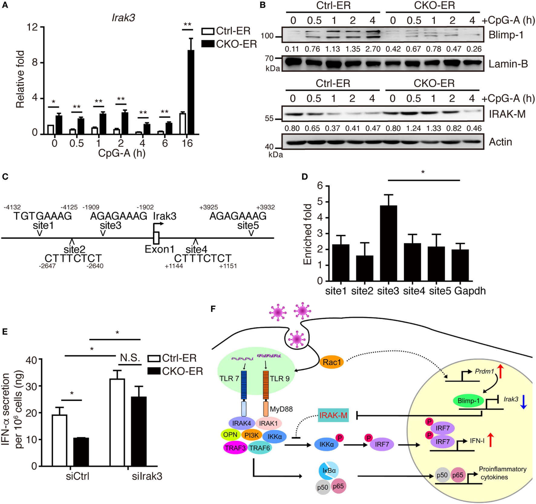 Increased IRAK-M expression in pDCs lacking Blimp-1 contributes to impaired IFN-I production. (A,B) RT-qPCR showing Irak3 mRNA levels (A), IRAK-M and Blimp-1 protein levels (B) in Ctrl-ER and CKO-ER FLpDCs treated with 4-OHT and then stimulated with 1 µM CpG-A. The quantitation of Blimp-1 in (B) was presented by the ratios of Blimp-1 band intensity vs. Lamin-B band intensity at each time point. The quantitation of IRAK-M in (B) was presented by the ratios of IRAK-M band intensity vs. actin band intensity at each time point. (C) Five putative Blimp-1 consensus binding sites were identified within 5 kb upstream and downstream of the Irak3 transcriptional start site (TSS, indicated by an arrow). (D) ChIP assay using chromatin isolated from FLpDCs following 4 h stimulation with 1 µM CpG-A showing the levels of binding of Blimp-1 at various putative sites. Gapdh was used as the negative control locus. (E) IFN-α production by Blimp-1-deficient and control FLpDCs transfected with control siRNA (siCtrl) or siRNA-pools with three different siRNAs against Irak3 (siIrak3) and stimulated with 1 µM CpG-A for 16 h. (F) Model of the action of Blimp-1 in the regulation of induction of IFN-I signaling in pDCs. Abbreviations: Rac, Ras-related C3 botulinum toxin substrate; IRAK-M, interleukin-1 receptor-associated kinase M; OPN, osteopontin; pDCs, plasmacytoid dendritic cells; IFN-I, type I IFN; siRNA, small-interfering RNA; Irak3, interleukin-1 receptor-associated kinase 3; ChIP, chromatin immunoprecipitation; RT-qPCR, RT-quantitative PCR. Data represent the mean ± SEM and were analyzed by two-tailed unpaired Student’s t-test [n = 4 in (A) and 3 in (D,E)]. *p < 0.05; **p < 0.01. N.S. = no significant difference.
