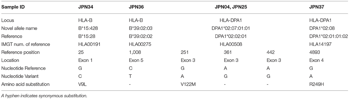 A total of 253 HLA allele sequences (20 HLA-A, 46 HLA-B, 26 HLA-C, 41 HLA-DRB1, 36 HLA-DQA1, 28 HLA-DQB1, 16 HLA-DPA1, and 40 HLA-DPB1) that covered the promoter-enhancer region, the intronic and exonic regions and across to 3′UTR were determined for the 46 Japanese samples by the PacBio, Ion PGM, and Sanger sequencing. Table S6 shows the genomic allele designation of the full-length HLA alleles (coding and non-coding sequences) up to the field-4 level for some variants for each sample and locus. Table S7 shows the allele names, DNA data bank of Japan (DDBJ) accession numbers, IMGT submission numbers, nucleotide length of each allele, novel or extended alleles, the location of variations, and the number of detected alleles.