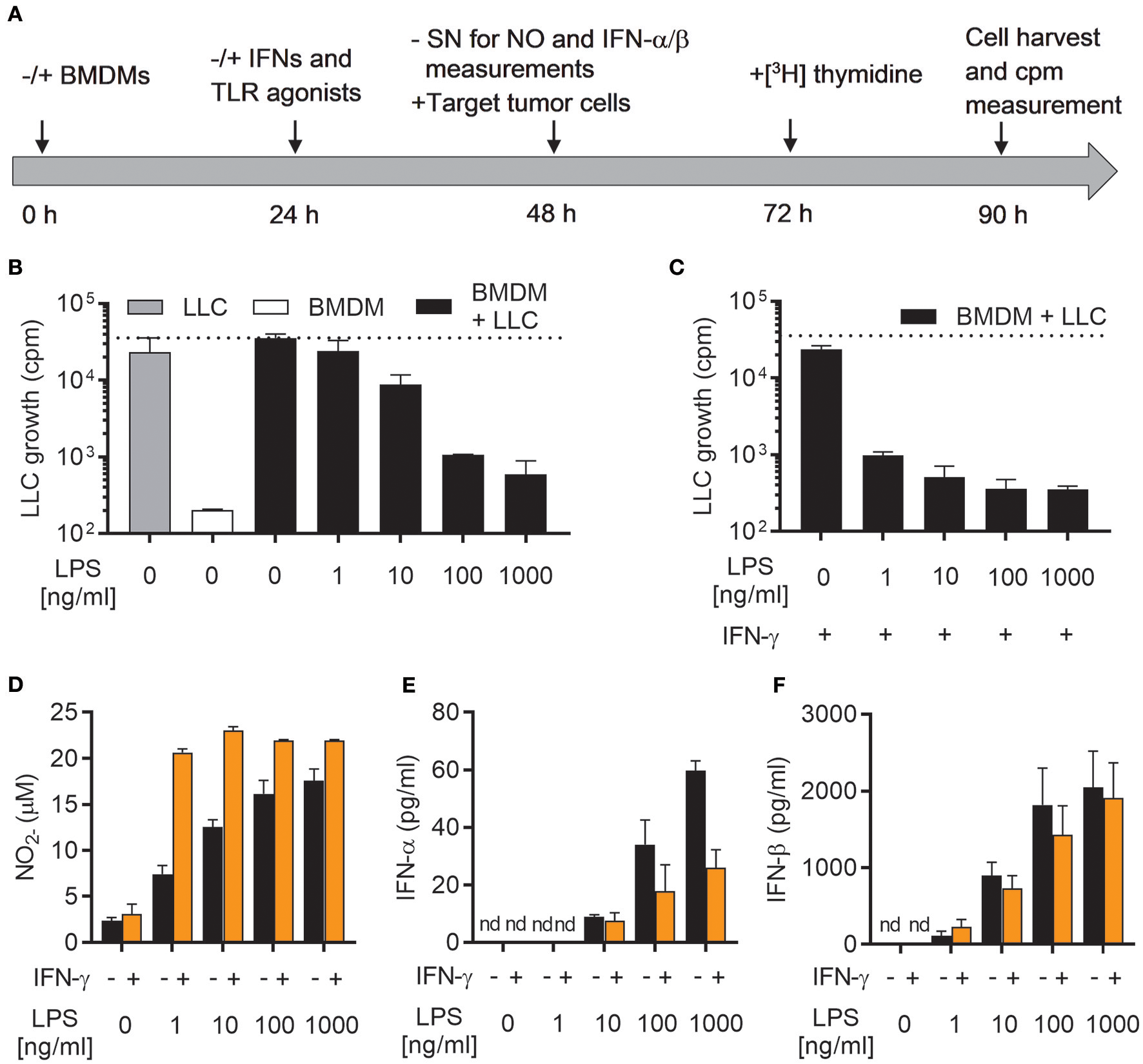 We have recently reported that LPS, a classical M1 stimulus, was the only TLR agonist which could activate mouse BMDMs to an antitumor phenotype in the absence of IFN-γ (19). To further investigate this phenomenon, we used a previously established growth inhibition assay (19), in which the growth of cancer cells cultured alone or together with mitomycin C-treated BMDMs was analyzed by measuring the incorporation of radiolabeled thymidine as schematically depicted in Figure 1A. A main advantage of such a growth inhibition assay is that both cytotoxic and cytostatic activities of activated macrophages against cancer cells are measured. BMDMs were left untreated or activated with the indicated factors for 24 h, before NO production and type I IFN secretion were measured in cell culture supernatants (Figure 1A). LLC cancer cells were then added as target cells and co-cultured with BMDMs for another 24 h before radiolabeled [3H] thymidine was added for the remaining 18 h of the assay. Finally, [3H] thymidine incorporation by LLC cells was analyzed as a measure for cancer cell proliferation (Figure 1A).
