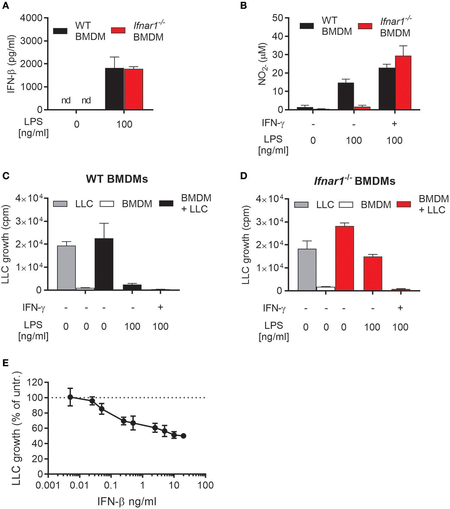 Role of autocrine type I IFNs for NO production and inhibitory activity of macrophages activated by LPS. (A) Levels of IFN-β in the supernatant of WT and IFN alpha/beta receptor 1 knockout (Ifnar1−/−) BMDMs left untreated or treated with 100 ng/mL LPS for 24 h. Data are presented as means ± SD of triplicate wells from a single experiment. (B) NO production, measured indirectly as nitrite (), by WT and Ifnar1−/− BMDMs (6 × 104 in 200 μL) in response to stimulation for 24 h with 100 ng/mL LPS alone or in combination with 40 ng/mL IFN-γ. (C,D) Growth inhibition of LLC cells co-cultured with WT (C) or Ifnar1−/−(D) BMDMs, which were stimulated as described in (B). Data in (B–D) are presented as means ± SD of triplicate wells from one representative experiment out of three. (E) Direct effect of exogenous IFN-β on the growth of LLC cells. The proportion of viable cells after 48 h of treatment with different concentrations of IFN-β was determined using the CCK-8 viability assay. Untreated cells were used as control and the results are presented in percentage of the untreated control group. Pooled data from four independent experiments are presented as means ± SD. nd, not detectable.