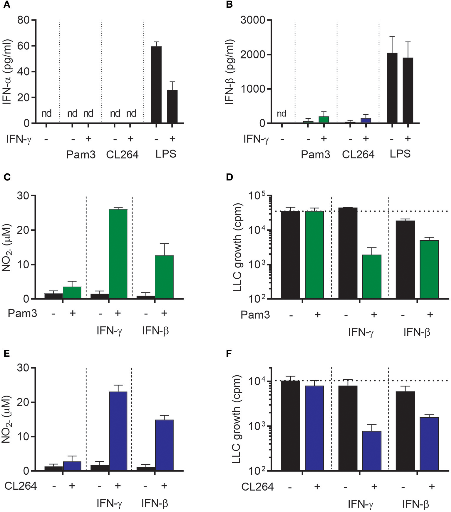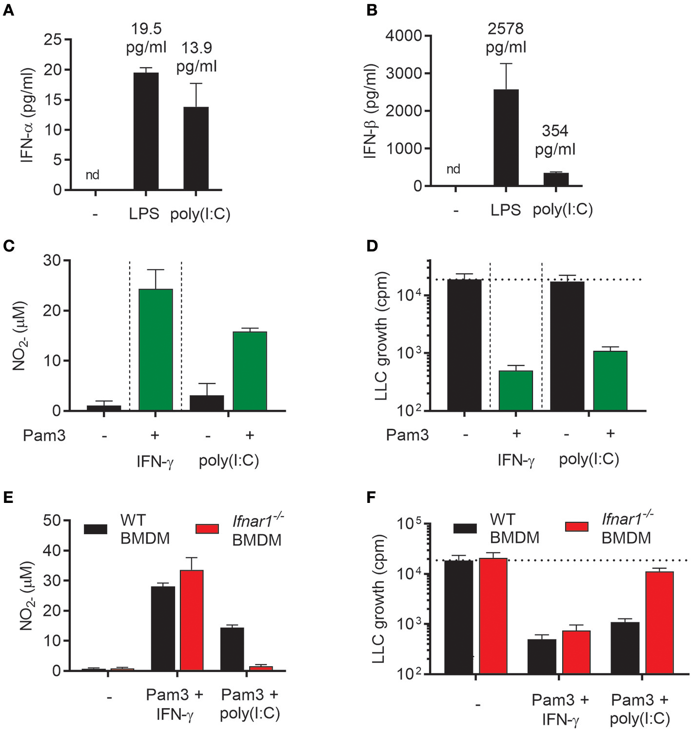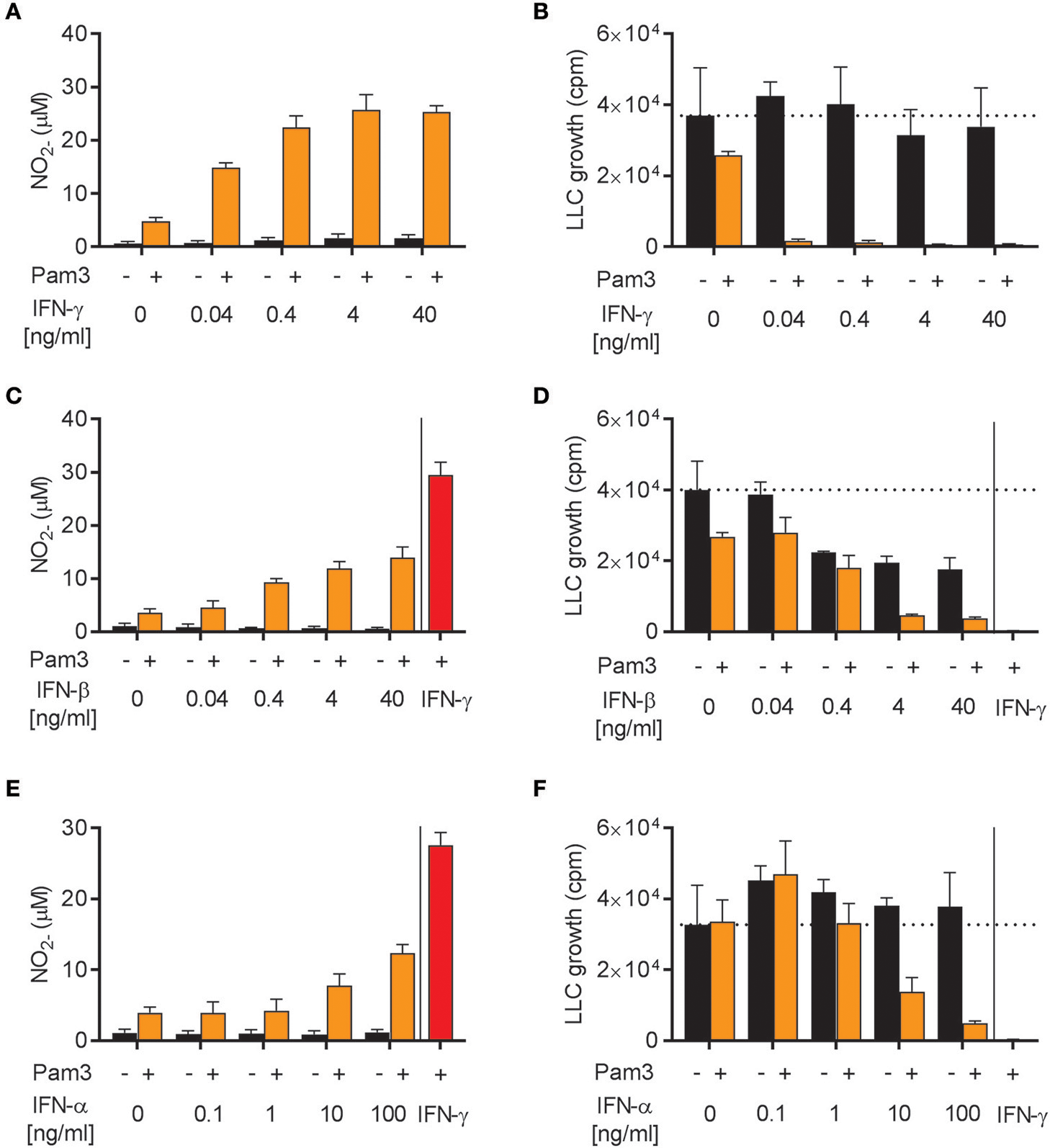 Both IFN-α and IFN-β synergize with Pam3CSK4 in inducing NO production by BMDMs and inhibition of tumor cell growth. (A) NO production, measured indirectly as nitrite (), by BMDMs (6 × 104 in 200 μL) stimulated for 24 h with the indicated concentrations of IFN-γ in the absence or presence of 100 ng/mL Pam3CSK4. (B) BMDMs were stimulated as described in (A) before LLC cells (3 × 103) were added to measure inhibition of LLC cell growth in co-cultures. (C) NO production by BMDMs stimulated with the indicated concentrations of IFN-β in the absence or presence of 100 ng/mL Pam3CSK4 for 24 h. (D) Inhibition of LLC cell growth in co-cultures with BMDMs stimulated as described in (C). (E) NO production by BMDMs stimulated with the indicated concentrations of IFN-α in the absence or presence of 100 ng/mL Pam3CSK4 for 24 h. (F) Inhibition of LLC cell growth in co-cultures with BMDMs stimulated as described in (E). In (C–F) 40 ng/mL IFN-γ was used as positive control. Data are presented as means ± SD of triplicate wells from one representative experiment out of three (A-F). Pam3, Pam3CSK4.