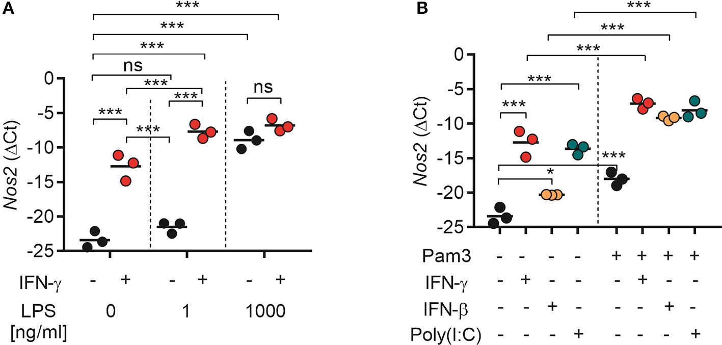 Both type I and II IFNs synergize with TLR agonists for induction of Nos2 gene expression. BMDMs (4.5 × 105) were stimulated for 24 h. Total RNA was reverse transcribed into cDNA and analyzed by RT-qPCR using primers specific for mouse Nos2 mRNA. (A)Nos2 expression in BMDMs treated with IFN-γ (40 ng/mL), or LPS at the indicated concentrations, or a combination of both. (B)Nos2 expression in BMDMs treated with IFN-γ (40 ng/mL), IFN-β (40 ng/mL), poly(I:C) (100 μg/mL), Pam3CSK4 (100 ng/mL), or the indicated combinations. Data are presented as means (ΔCt) of duplicates for each of the three independent experiments. Each circle in the graphs represents the mean value from one experiment. P-values from a two-way ANOVA multiple comparison test is displayed as follows: *p < 0.05, ***p < 0.001; ns, not significant; Pam3, Pam3CSK4.