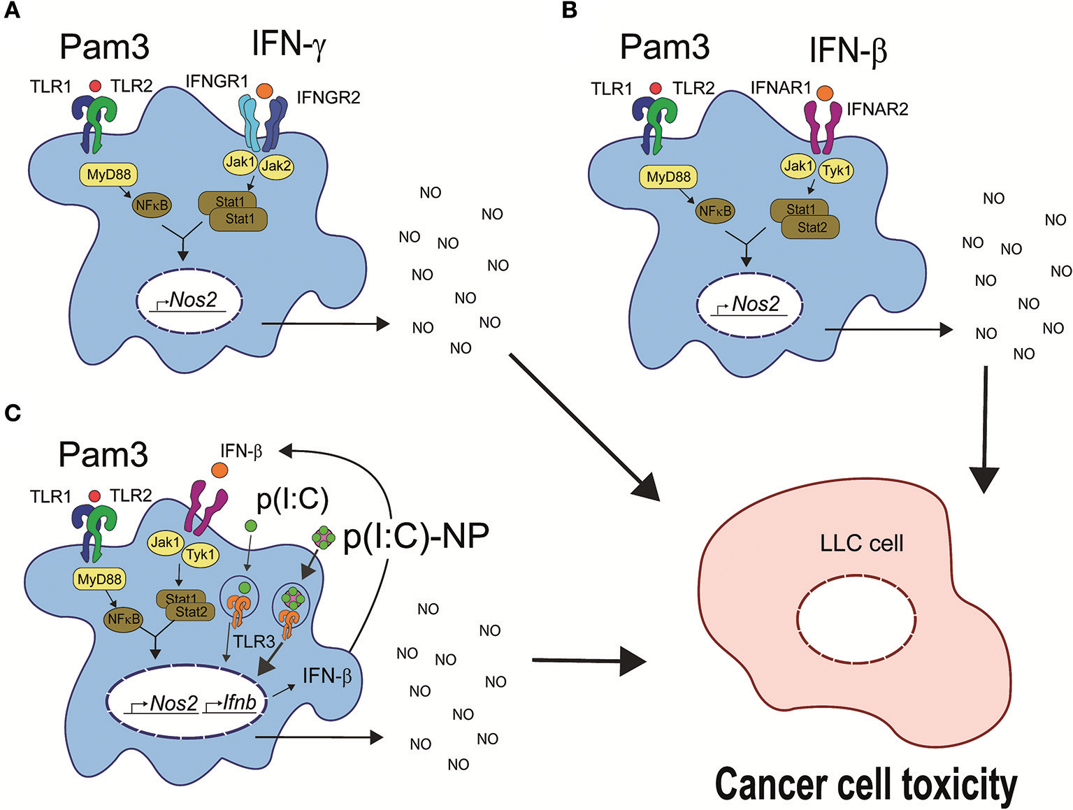 Three possible pathways for induction of antitumor macrophages. (A) TLR agonists such as LPS or Pam3CSK4 synergize with IFN-γ for induction of antitumor macrophages. TLR signaling through MyD88 leads to activation of NF-κB, and IFN-γ signaling through the tyrosine kinases Jak1 and Jak2 leads to STAT1 homodimer formation (61). The two pathways synergize to induce transcription of Nos2 and NO production resulting in cancer cell growth inhibition and cell toxicity. (B) Synergy between a TLR agonist such as Pam3CSK4 with recombinant IFN-β for induction of antitumor macrophages. IFN-β signals through the tyrosine kinases Jak1 and Tyk2 resulting in STAT1/STAT2 heterodimer formation (62), which synergize with TLR-induced NF-κB for induction of Nos2 gene transcription similar to (A). (C) The TLR agonists Pam3CSK4 and poly(I:C) synergize through endogenous type I IFN production for induction of antitumor macrophages. Poly(I:C) signals through TLR3 and induces endogenous IFN-β production, which mediates the second signal and synergizes with TLR signaling as described for exogenous IFN-β in (B). Pam3, Pam3CSK4.