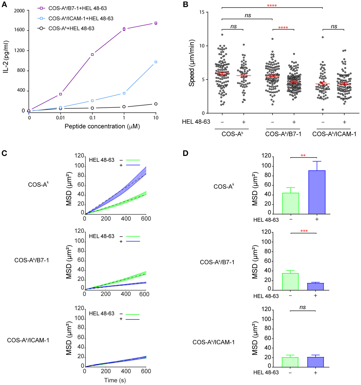 Figure 1. B7-1 expression on COS APCs provides efficient costimulatory signaling to naive CD4+ T cells. (A) Activation of naive CD4+ T cells upon contact with COS APCs loaded with HEL 48–63 peptides. 5 × 105 naive CD4+ T cells from 3A9 TCRtg mice were cultured at 37°C with COS-Ak, COS-Ak/B7-1, COS-Ak/ICAM-1 cells, loaded or not with different doses of HEL 48–63. T cells were harvested after 20 h. IL-2 concentration in the supernatants was measured by ELISA. Data represented the mean of three individual experiments. Data: mean ± s.d. (B) Naive CD4+ T cells form mobile contacts with COS APCs loaded or not with HEL 48–63. Naive CD4+ T cells from 3A9 TCRtg mice were loaded onto APCs monolayers of COS-Ak, COS-Ak/B7-1, COS-Ak/ICAM-1 cells grown to confluency on Lab-Tek chamber slide, loaded or not with 1 μM HEL 48–63. T cell trajectories were recorded for 45 min at 37°C using confocal video-microscope. Average migration speed over the whole trajectory was calculated as described in Materials and Methods. Data: mean ± SEM. Their numerical values were 5.96 ± 0.21 μm/min (n = 105), 5.57 ± 0.24 μm/min (n = 56), 5.59 ± 0.18 μm/min (n = 111), 4.68 ± 0.11 μm/min (n = 134), 4.36 ± 0.23 μm/min (n = 60), and 4.36 ± 0.17 μm/min (n = 93) for the T cells contacting with COS-Ak, COS-Ak plus HEL 48–63, COS-Ak/B7-1, and COS-Ak/B7-1 plus HEL 48–63, COS-Ak/ICAM-1, and COS-Ak/ICAM-1 plus HEL 48–63, respectively. (C) Mean square displacement over time and (D) average mean square displacement over 10 min of T cells seeded onto COS-Ak, COS-Ak/B7-1, and COS-Ak/ICAM-1 cells, loaded or not with 1 μM HEL 48–63, respectively. Mann–Whitney tests were performed using Graphpad prism 7.0 for comparisons between two groups. Statistical significance was set at 0.05, and p-values < 0.05 were denoted in red. **p < 0.01, ***p < 0.001, and ****p < 0.0001.