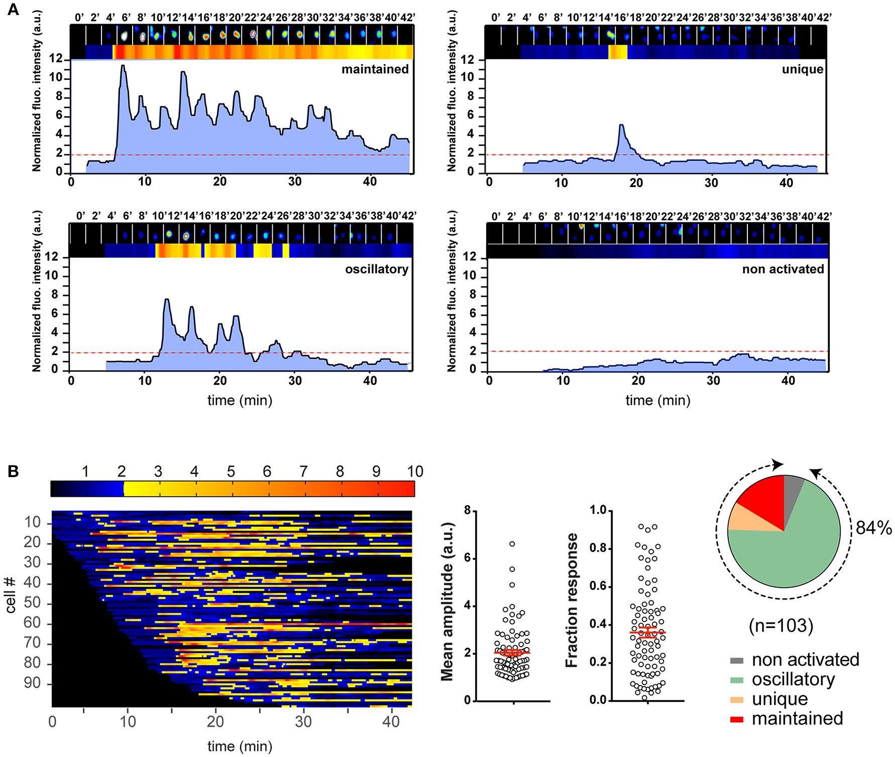 Figure 2. Illustration of the T cell calcium response analysis with an example experiment. Naive 3A9 TCRtg CD4+ T cells were loaded with Fluo-4 PBX before incubation at 37°C for 45 min with COS-Ak pulsed with 10 μM HEL 48–63. Time-lapse movies of T cells were made using confocal microscope as described in Materials and Methods. (A) Single cell fluorescence recordings analyzed by MAAACS and categorized into different classes according to the magnitude and shape of fluorescence signals. The examples of four different response types are shown. In each panel, the top row is made up of 2 min-delayed snapshots of raw images of a cell. Just below are the normalized fluorescence intensities displayed in the form of a bar code and a line profile, respectively. The non-activated cells are defined as cells whose normalized fluorescence intensities have never reached the activation threshold (set at 2.0, red dotted line, see Methods and Materials for more details) along the whole trace. For the activated cells, we defined a response as “maintained” when the response fraction (RF) was higher than 0.8, and “unique” when the response fraction was lower than 0.2 with a single burst. In all other situations, calcium responses were “oscillatory.” (B) Color barcoding and calculation of the analytical parameters of the calcium response. The normalized fluorescence amplitude of each cell is plotted along a horizontal line as a function of time with a color-coded intensity (dark to blue below the threshold of activation and yellow to red above the threshold of activation). The analytical parameters of the calcium response, i.e., the mean amplitude (MA) and RF calculated by MAAACS are plotted (mean ± SEM). The global overview of the cell response heterogeneity is summarized in the form of a pie chart.