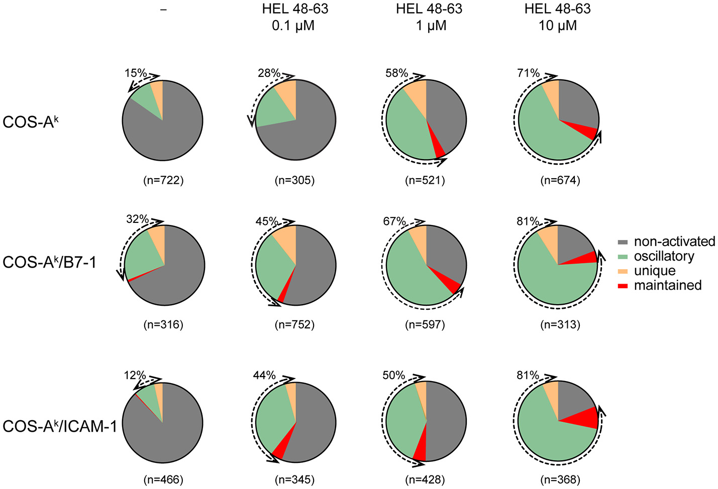 Figure 3. Naive CD4+ T cells show various calcium response modes upon different stimulation. Naive 3A9 TCRtg CD4+ T cells were loaded with Fluo-4 PBX before incubation at 37°C for 45 min with COS APC cells pulsed without or with different doses of HEL 48–63 as indicated. Time-lapse movies of T cells were made by confocal microscope as described in Materials and Methods. For each antigenic peptide concentration, modes of calcium response are represented as a pie chart: non-activated in gray, maintained in red, oscillatory in green, and unique in yellow. The total number of cells analyzed is indicated in parentheses. The percentage of activated (reacting) cells is shown by the double arrows, and their values are indicated.