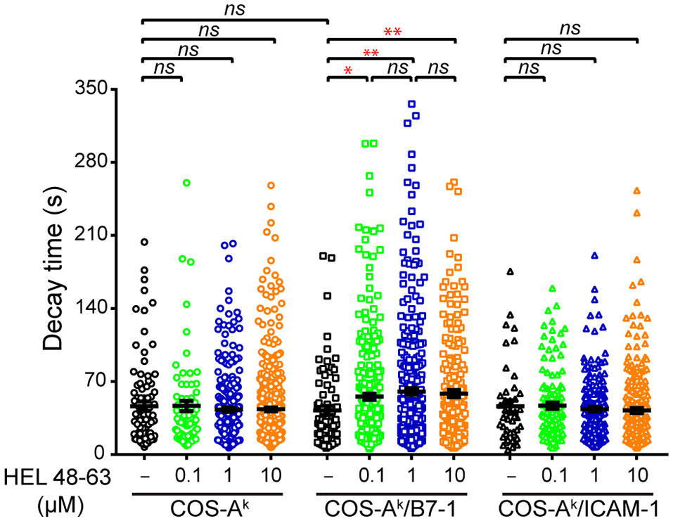 Figure 5. Comparisons of decay time (τ) of calcium response in naive CD4+ T cells upon different stimulation. Naive 3A9 TCRtg CD4+ T cells stained with Fluo-4 PBX were loaded onto COS APC monolayers at 37°C and observed for 45 min. APC cells were loaded or not with 0.1, 1, and 10 μM HEL 48–63. Analysis of average decay time (τ) was performed as described in Materials and Methods. Data: mean ± SEM. Mann–Whitney tests were performed using Graphpad prism 7.0 for comparisons between two groups. Statistical significance was set at 0.05, and p-values < 0.05 were denoted in red. *p < 0.05 and **p < 0.01.