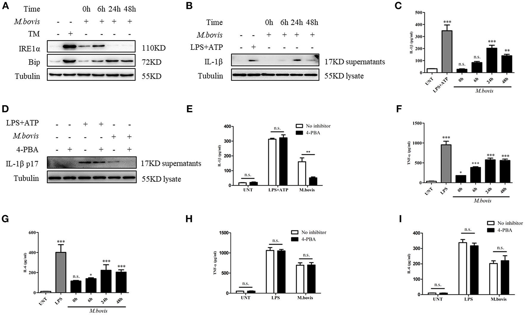 M. bovis-induced inflammasome activation requires ERS. (A) Immunoblot analysis at different time-points of Bip and p-IRE1α in lysates of BMDMs infected with M. bovis (MOI 10). (B) Immunoblot analysis at different time-points of IL-1β in supernatants of BMDMs infected with M. bovis (MOI 10). (C) ELISA for IL-1β analysis from supernatants of BMDMs infected with M. bovis (MOI 10). (D) IL-1β immunoblot analysis of supernatants from BMDM infected for 24 h with M. bovis (MOI 10) in the presence or absence of 4-PBA. (E) ELISA for IL-1β quantification from supernatants of BMDMs treated with or without 4-PBA for 1 h and then infected with M. bovis (MOI 10) for 24 h. ELISA for (F) TNF- α and (G) IL-6 detection in supernatants from M. bovis (MOI 10) infected BMDMs. ELISA for (H) TNF-α and (I) IL-6 detection from supernatants of BMDMs treated with or without 4-PBA for 1 h and then infected with M. bovis (MOI 10) for 24 h. TM, tunicamycin, positive control for ERS induced mitochondrial damage, 10 μg/mL; LPS+ATP, positive control for inflammasome activation, 200 ng/mL, and 1 mM, respectively; LPS, positive control for TNF-α and IL-6 production, 200 ng/mL; UNT, untreated; 4-PBA, 4-phenyl butyric acid, ERS inhibitor, 5 mM; MOI, multiplicity of infection. For (C,F,G), Data are representative of at least three independent experiments, each performed in triplicate for WB. The results are shown are the mean ± SD. The asterisks indicate statistically significant differences compared with untreated cells (*P < 0.05, **P < 0.01, ***P < 0.001, n.s., not significant). P-values were obtained by using one-way ANOVA followed by post-hoc Turkey' comparison test. For (E,H,I), data are representative of at least three independent experiments. The results are shown as the mean ± SD. *P < 0.05, **P < 0.01, ***P < 0.001, n.s., not significant. P-values were analyzed using Student's t-test.