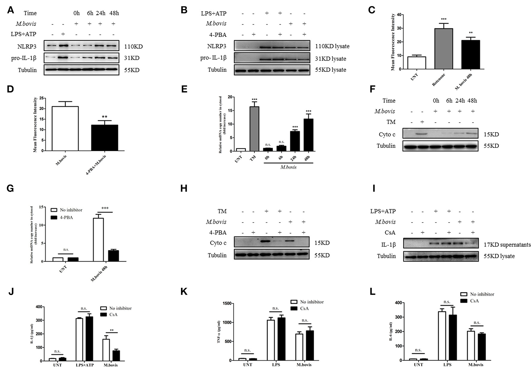 ERS-induced mitochondrial dysfunction is involved in inflammasome activation. (A) Immunoblot analysis at different time-points of NLRP3 and pro-IL-1β in lysates of BMDMs infected with M. bovis (MOI 10). (B) Immunoblot analysis of NLRP3 and pro-IL-1β in lysates from BMDMs infected for 24 h with M. bovis (MOI 10) in the presence or absence of 4-PBA. Control image is the same as Figure 1D. (C) ROS production measured at various time-points by flow cytometry in BMDMs infected with M. bovis (MOI 10). (D) ROS production was measured by flow cytometry in BMDMs infected for 48 h with M. bovis (MOI 10) in the presence or absence of 4-PBA. (E) qPCR analysis of mtDNA release into the cytosol during M. bovis (MOI 10) infection. (F) Immunoblot analysis at different time-points of cytochrome c in cytosolic extracts of BMDMs infected with M. bovis (MOI 10). (G) qPCR analysis of mtDNA release into the cytosol in BMDMs treated with or without 4-PBA for 1 h and then infected with M. bovis (MOI 10) for 48 h. (H) Immunoblot analysis of cytochrome c in cytosolic extracts from BMDMs infected with M. bovis (MOI 10) for 48 h in the absence or presence of 4-PBA. (I) IL-1β immunoblot analysis of supernatants from BMDMs infected for 24 h with M. bovis (MOI 10) in the presence or absence of CsA. (J) ELISA for IL-1β detection in supernatants from BMDMs treated with or without CsA for 1 h and then infected with M. bovis (MOI 10) for 24 h. Control image is the same to Figure 1E. ELISA for (K) TNF-α and (L) IL-6 quantification in supernatants from BMDMs treated with or without CsA for 1 h and then infected with M. bovis (MOI 10) for 24 h. Control image is the same to Figures 1H,I. LPS+ATP, positive control for inflammasome activation, 200 ng/ml, and 1 mM, respectively; LPS, positive control for TNF-α and IL-6 production, 200 ng/ml; 4-PBA, 4-phenyl butyric acid, ERS inhibitor, 5 mM; UNT, untreated; rotenone, positive control for ROS production, 40 μM; TM, tunicamycin, positive control for ERS-induced mitochondrial damage, 10 μg/mL; CsA, cyclosporine A, inhibitor of MPTP opening, 10 μM; siNLRP3, silencing RNA for NLRP3, 50 nM; siAIM2, silencing RNA for AIM2, 50 nM; siCon, non-targeting control siRNA, 50 nM. MOI, multiplicity of infection. For (C,E), data are representative of at least three independent experiments. The results are shown as the mean ± SD. The asterisks indicate statistically significant differences compared with untreated cells (**P < 0.01, ***P < 0.001, n.s., not significant). P-values were analyzed by using one-way ANOVA followed by post-hoc Tukey's test. For (D,G,J–L), data are representative of at least three independent experiments, each performed in triplicate for WB. The results are shown as mean ± SD. **P < 0.01, ***P < 0.001, n.s., not significant. P-values were analyzed by using Student's t-test.