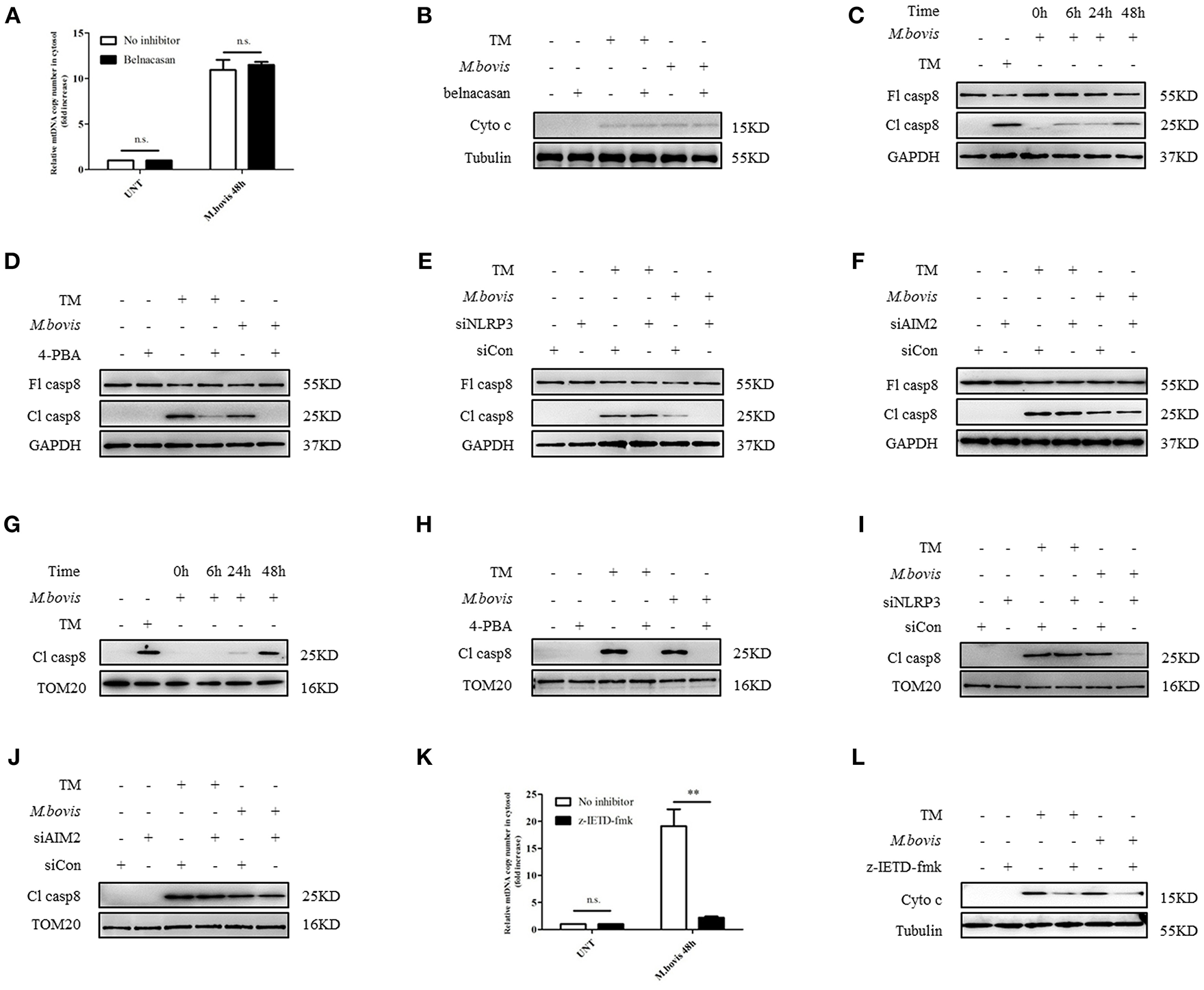 NLRP3 and caspase-8 are required for ERS-induced mitochondrial damage. (A) qPCR analysis of mtDNA release into the cytosol in BMDMs treated with no inhibitor and belnacasan for 1 h and then infected with M. bovis (MOI 10) for 48 h. (B) Immunoblot analysis of cytochrome c in the cytosolic extracts from BMDMs treated with no inhibitor or belnacasan for 1 h and then infected with M. bovis (MOI 10) for 48 h. (C) Immunoblot analysis at different time points of caspase-8 in lysates of BMDMs infected with M. bovis (MOI 10). (D) Immunoblot analysis of caspase-8 in lysates of BMDMs treated with no inhibitor or 4-PBA for 1 h and then infected with M. bovis (MOI 10) for 48 h. (E) Immunoblot analysis of caspase-8 in lysates of BMDMs transfected with control non-targeting siRNA (siCon) or NLRP3 targeting siRNA (siNLRP3) and then infected for 48 h with M. bovis (MOI 10). (F) Immunoblot analysis of caspase-8 in lysates of BMDMs transfected with siCon or siAIM2 and then infected for 48 h with M. bovis (MOI 10). (G) Immunoblot analysis at different time points of cleaved caspase-8 in the mitochondrial fraction of BMDMs infected with M. bovis (MOI 10). (H) Immunoblot analysis of caspase-8 in the mitochondrial fraction of BMDMs infected with M. bovis (MOI 10) for 48 h in the presence or absence of 4-PBA. (I) Immunoblot analysis of caspase-8 in the mitochondrial fraction of BMDMs transfected with control non-targeting siRNA (siCon) or NLRP3 (siNLRP3) targeting siRNA and then infected for 48 h with M. bovis (MOI 10). (J) Immunoblot analysis of caspase-8 in the mitochondrial fraction of BMDMs transfected with control non-targeting siRNA (siCon) or AIM2 targeting siRNA (siAIM2) and then infected for 48 h with M. bovis (MOI 10). (K) qPCR analysis of mtDNA release into the cytosol in BMDMs treated with no inhibitor or z-IETD-fmk for 1 h and then infected with M. bovis (MOI 10) for 48 h. (L) Immunoblot analysis of cytochrome c in cytosolic extracts from BMDMs infected with M. bovis (MOI 10) in the absence or presence of z-IETD-fmk. UNT, untreated; belnacasan, inhibitor of caspase-1, 20 μM; TM, tunicamycin, positive control for ERS-induced caspase-8 cleavage, 10 μg/mL; 4-PBA, 4-phenyl butyric acid, ERS inhibitor, 5 mM; z-IETD-fmk, caspase-8 inhibitor, 50 μM; Fl casp8, full-length caspase-8; Cl casp8, cleaved caspase-8; siNLRP3, silencing RNA for NLRP3, 50 nM; siAIM2, silencing RNA for AIM2, 50 nM; siCon, non-targeting control siRNA, 50 nM. MOI, multiplicity of infection. The data are representative of at least three independent experiments, each measured in triplicate. The results are shown as the mean ± SD. **P < 0.01, n.s., not significant. P-values were analyzed by using Student's t-test.