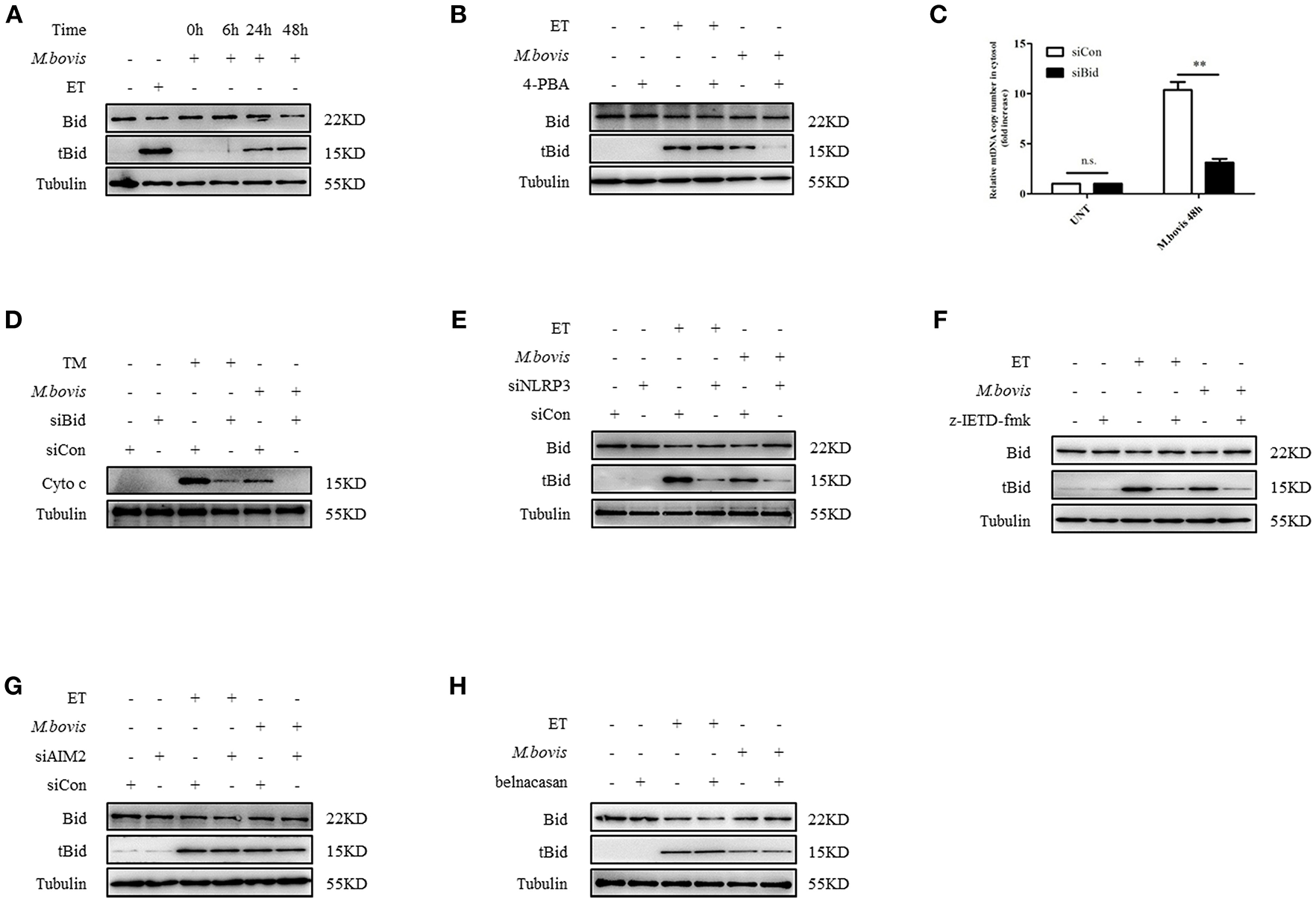 NLRP3 and caspase-8 drive mitochondrial dysfunction through the pore-activating factor, Bid. (A) Immunoblot analysis at different time points of Bid in lysates of BMDMs infected with M. bovis (MOI 10). (B) Immunoblot analysis of Bid in lysates of BMDMs infected with M. bovis (MOI 10) in the presence or absence of 4-PBA. (C) qPCR analysis of mtDNA in cytosolic extracts from BMDMs transfected with control non-targeting siRNA (siCon) or Bid targeting siRNA (siBid) followed by M. bovis (MOI 10) infection for 48 h. (D) Immunoblot analysis of cytochrome c in cytosolic extracts from BMDMs transfected with control non-targeting siRNA (siCon) or Bid targeting siRNA (siBid) followed by M. bovis (MOI 10) infection for 48 h. (E) Immunoblot analysis of Bid in lysates of BMDMs transfected with control non-targeting siRNA (siCon) or NLRP3 targeting siRNA (siNLRP3) and then infected with M. bovis (MOI 10) for 48 h. (F) Immunoblot analysis of Bid in lysates of BMDMs treated with or without z-IETD-fmk for 1 h and then infected with M. bovis (MOI 10) for 48 h. (G) Immunoblot analysis of Bid in lysates of BMDMs transfected with control non-targeting siRNA (siCon) or AIM2 targeting siRNA (siAIM2) and then infected with M. bovis (MOI 10) for 48 h. (H) Immunoblot analysis of Bid in lysates of BMDMs treated with or without belnacasan for 1 h and then infected for 48 h with M. bovis (MOI 10). ET, etoposide, positive control for Bid truncation, 25 μM; 4-PBA, 4-phenyl butyric acid, ERS inhibitor, 5 mM; UNT, untreated; TM, tunicamycin, positive control for ERS induced mitochondrial damage, 10 μg/ml, z-IETD-fmk, caspase-8 inhibitor, 50 μM. Belnacasan, inhibitor of caspase-1, 20 μM; siNLRP3, silencing RNA for NLRP3, 50 nM; siAIM2, silencing RNA for AIM2, 50 nM; siBid, silencing RNA for Bid, 50 nM; siCon, non-targeting control siRNA, 50 nM. MOI, multiplicity of infection. Data are representative of at least three independent experiments. The results are shown as the mean ± SD. **P < 0.01, n.s., not significant. P-values were analyzed by using Student's t-test.