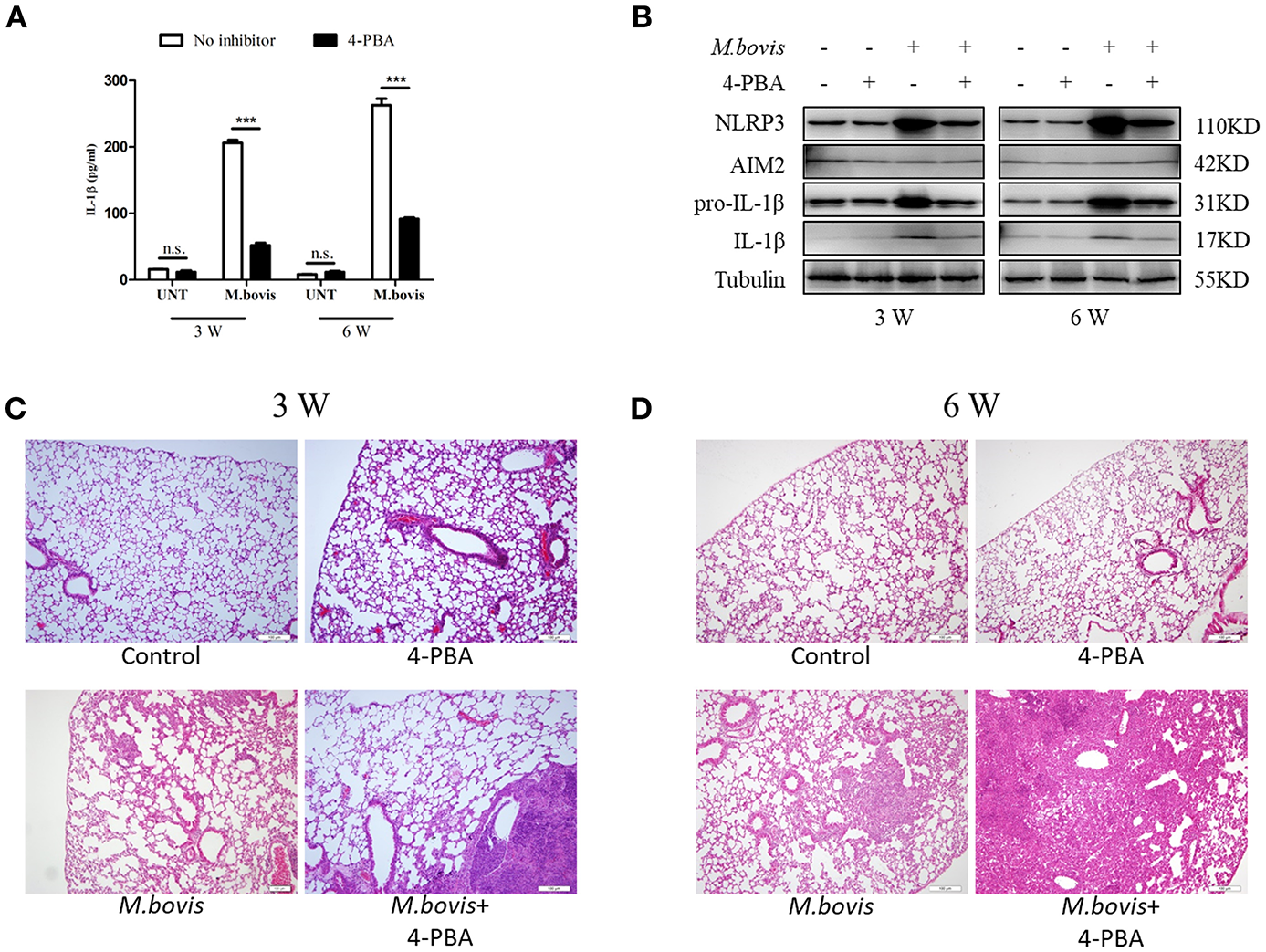 ERS mediates M. bovis-induced inflammasome activation in vivo. (A) ELISA detection of IL-1β in serum samples from C57BL/6 mice treated with or without 4-PBA (18.6 mg/mouse/day) and infected with M. bovis (CFU 200) (n = 7). (B) Immunoblot analysis of NLRP3, AIM2, pro-IL-1β, and IL-1β in the lung tissues of M. bovis-infected mice in the presence or absence of 4-PBA. (C,D) Pathological lesions (H&E staining) in the lung of mice infected with M. bovis for 3 weeks (C) or 6 weeks (D) in the presence or absence of 4-PBA (18.6 mg/mouse/day) (n = 3). 4-PBA, 4-phenyl butyric acid, ERS inhibitor, 18.6 mg/mouse/day; CFU, colony forming units (n = 3). The results are shown as the mean ± SD. ***P < 0.001, n.s., not significant. P-values were analyzed by using Student's t-test (C,D). Scale bar = 100 μm.