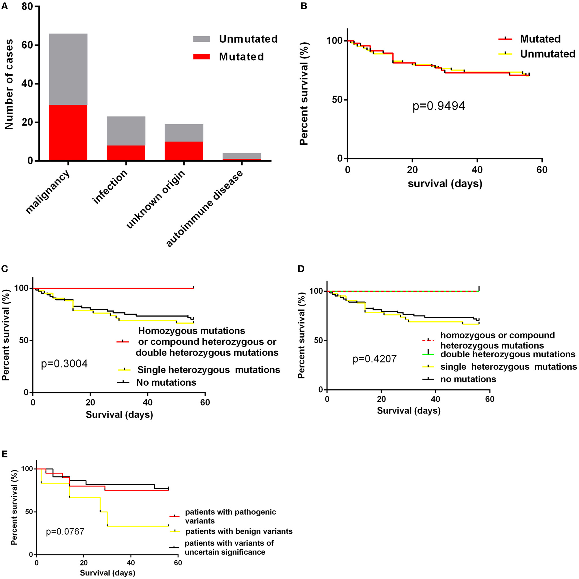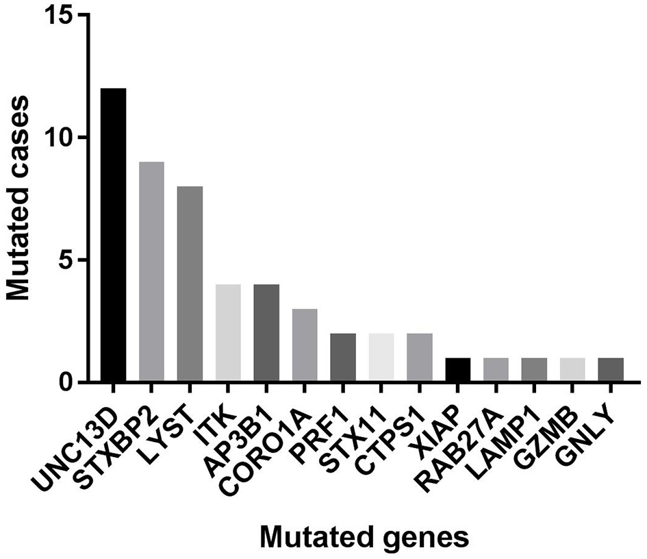 As this is a retrospective study, we are not able to conduct immunologic experiments including NK cell cytotoxicity, perforin or CD107a expression tests in our patients, making it less possible for us to analyze the association between those phenotypic characteristics and genetic variants. Although TGS enables simultaneous sequencing of multiple genes, in some cases, it remains insufficient for exploring the mechanisms underlying development of HLH. According to a study in pediatric cases (32), whole-exome sequencing (WES) can help find molecular explanations for the pathogenesis of HLH when target gene sequencing fails. This may also apply to adult cases with HLH.