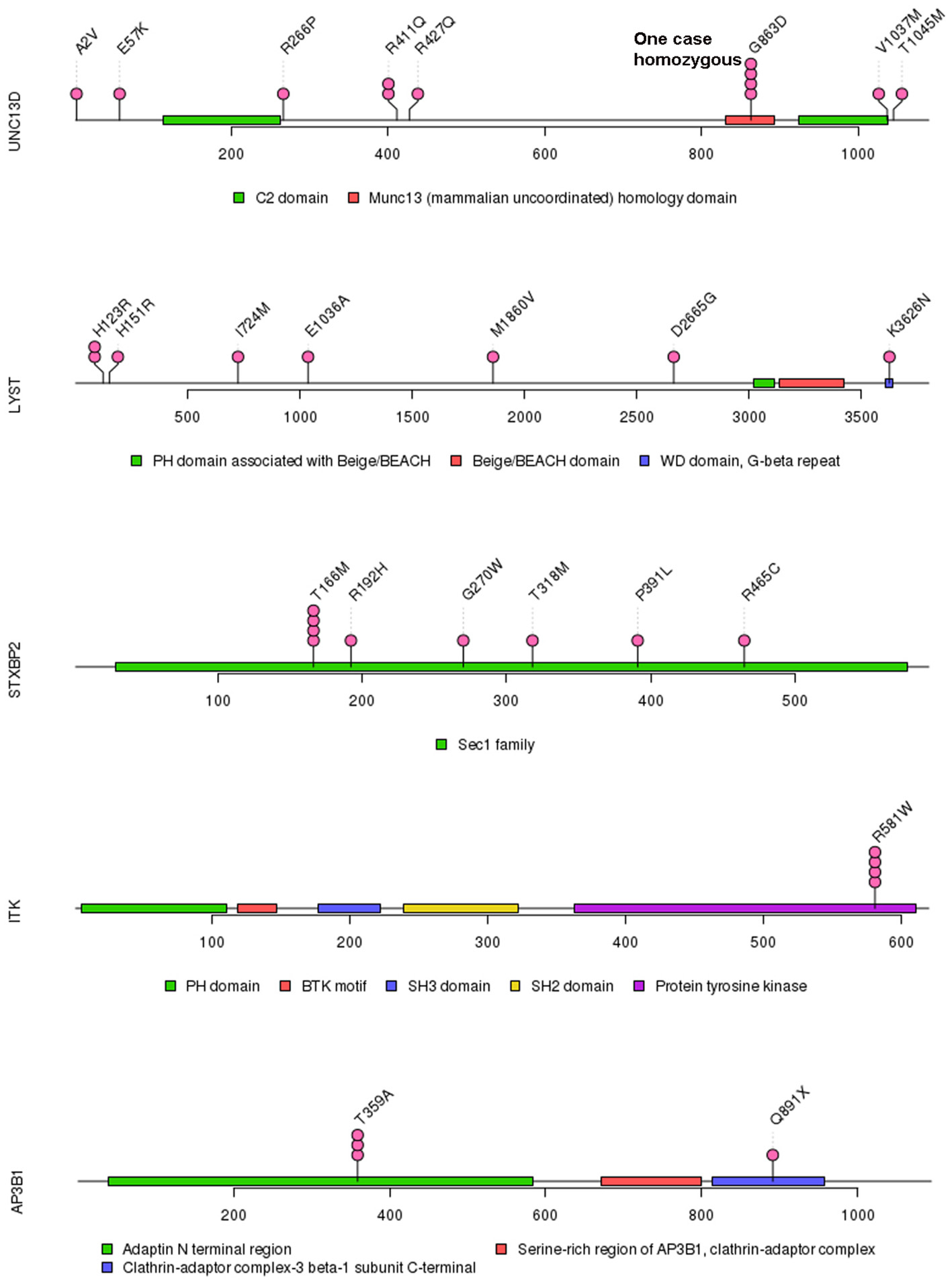 Of 18 genes tested in our cohort, 14 genes were found to be mutated at least one time, and UNC13D was the most frequently mutated gene (Figure 1). Thirty-nine mutations or rare variants were identified in this cohort, and in silico analysis and frequencies in normal Eastern Asian population (from ExAC database) and 1,000 genomes of these variants were summarized in Table 2. Some of the variants were previously reported in cases of HLH and the references were provided in Table 2 (16–25). And the conditions and clinical significance of variants documented in ClinVar database (https://www.ncbi.nlm.nih.gov/clinvar) were also listed in Table 2. We further classified these variants based on the pathogenicity predicted by the algorithms. These variants that were predicted to be pathogenic (including possibly pathogenic) or not pathogenic by all three algorithms were classified as “pathogenic variants” (n = 12) or “benign variants” (n = 7), respectively. The remaining variants were classified as “variants of uncertain significance” (n = 20). The variants involving UNC13D, LYST, STXBP2, ITK, and AP3B1 were depicted in Figure 2.