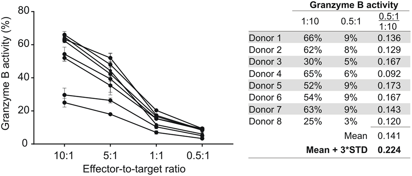 To assess CD8+ T cell mediated granzyme B responses, HIV-1 positive donors with <5% NK cell contamination in their enriched CD8+ T cell fractions were identified and selected for further analysis. This proportion of NK cells equates to a <0.5:1 NK-to-target ratio in a 10:1 CD8-to-target preparation. In our experience, the NK cell-mediated granzyme B activity at 0.5:1 is on average 14.1% (standard deviation [SD]: 2.8%) of that observed for NK cells at a ratio of 10:1 (Figure 1). Using these data, a positivity threshold for CD8+ T cell-mediated granzyme B responses was calculated relative to autologous NK cell-mediated granzyme B responses whereby the mean granzyme B activity for autologous NK cells (E:T = 10:1) was multiplied with 22.4% (14.1% + 3 × SD:2.8%).